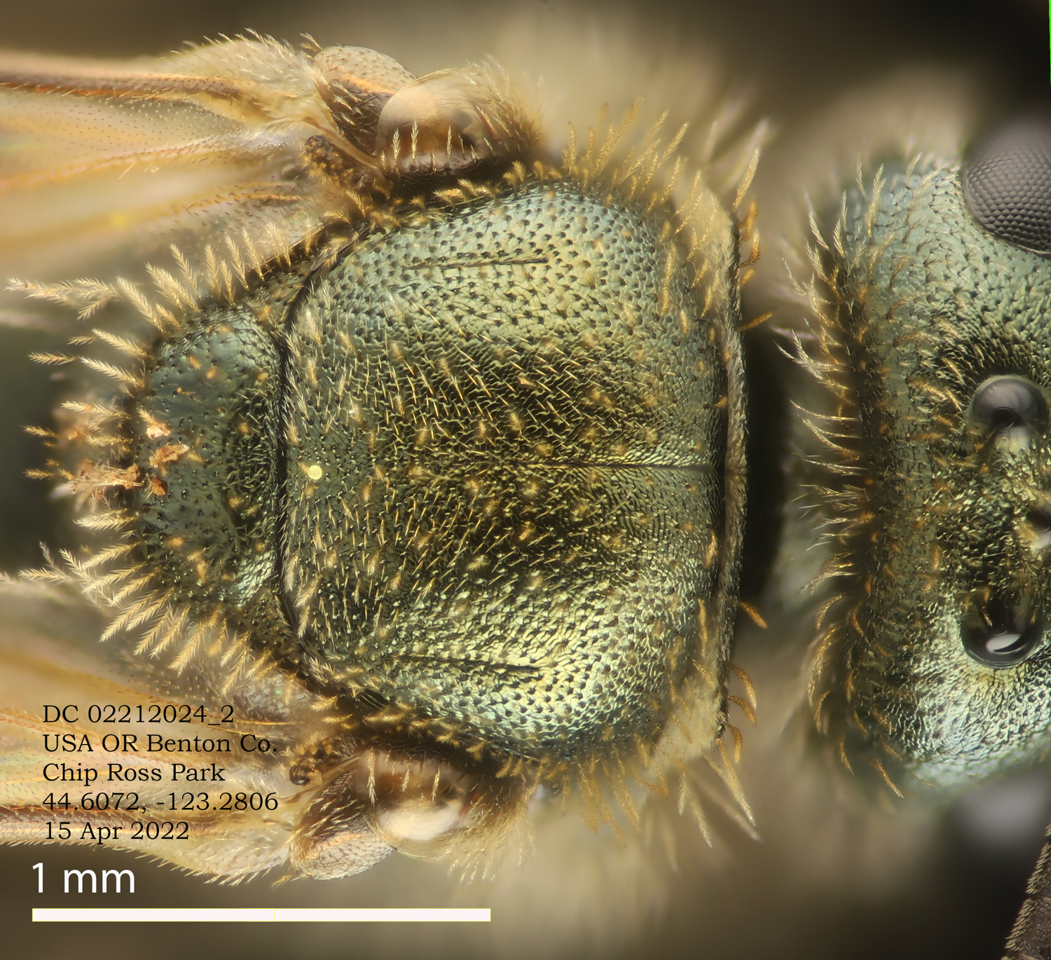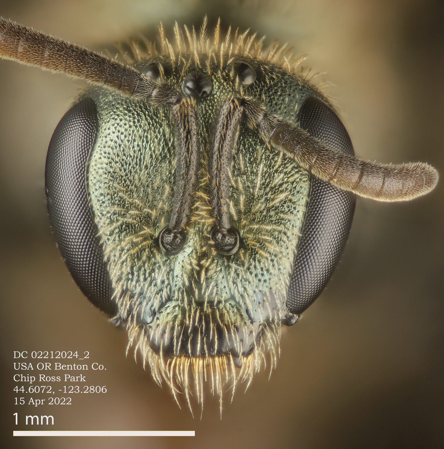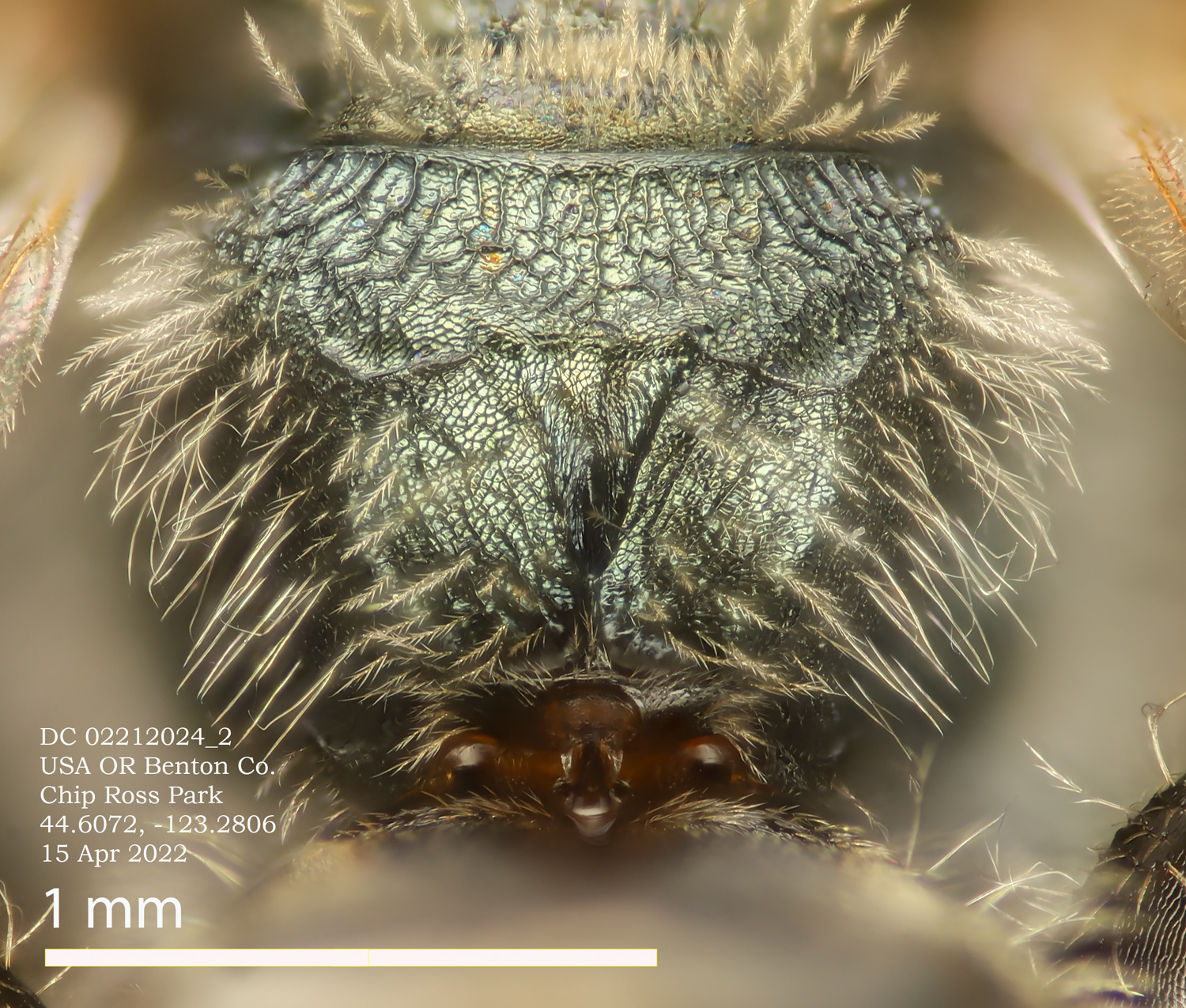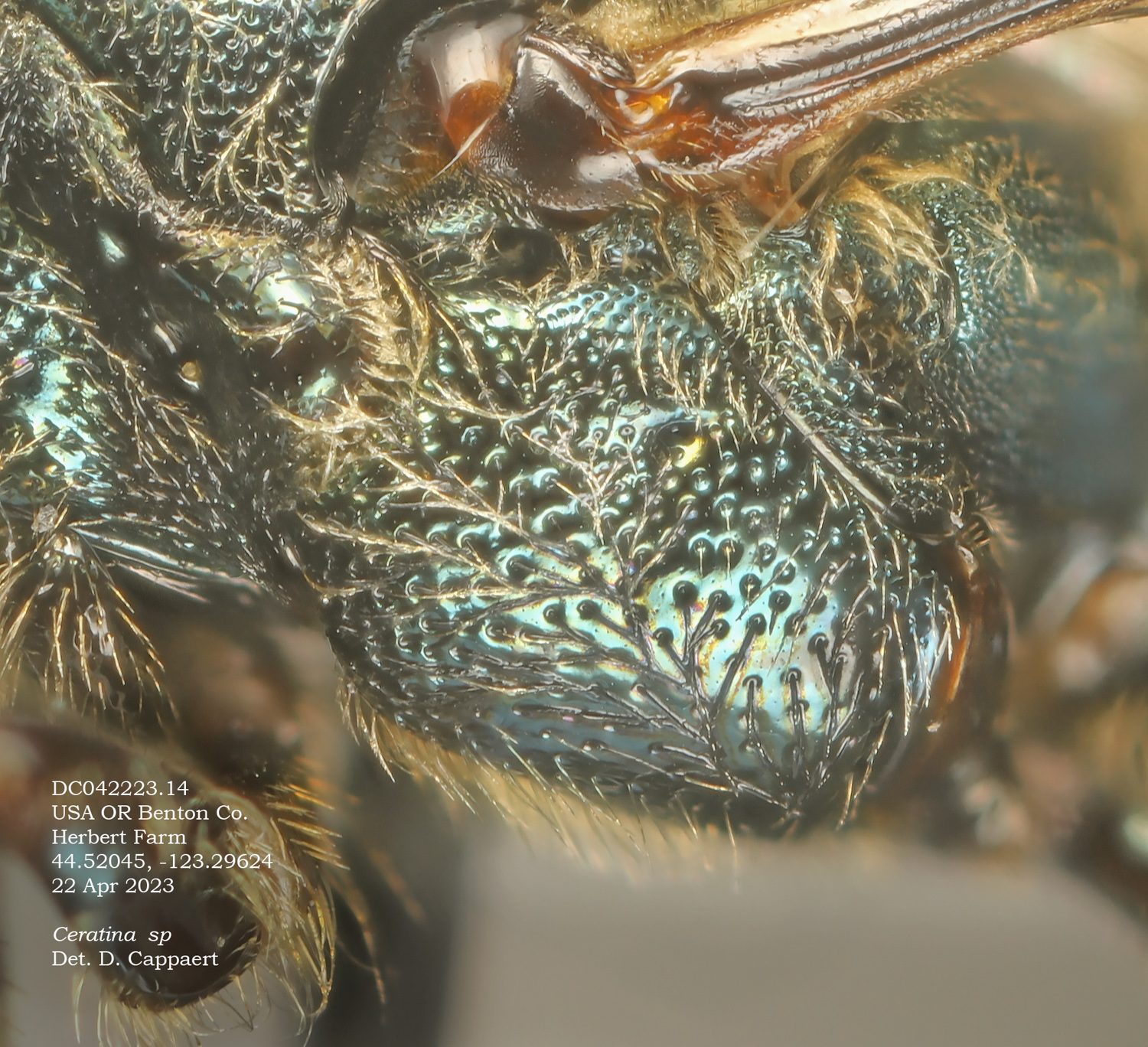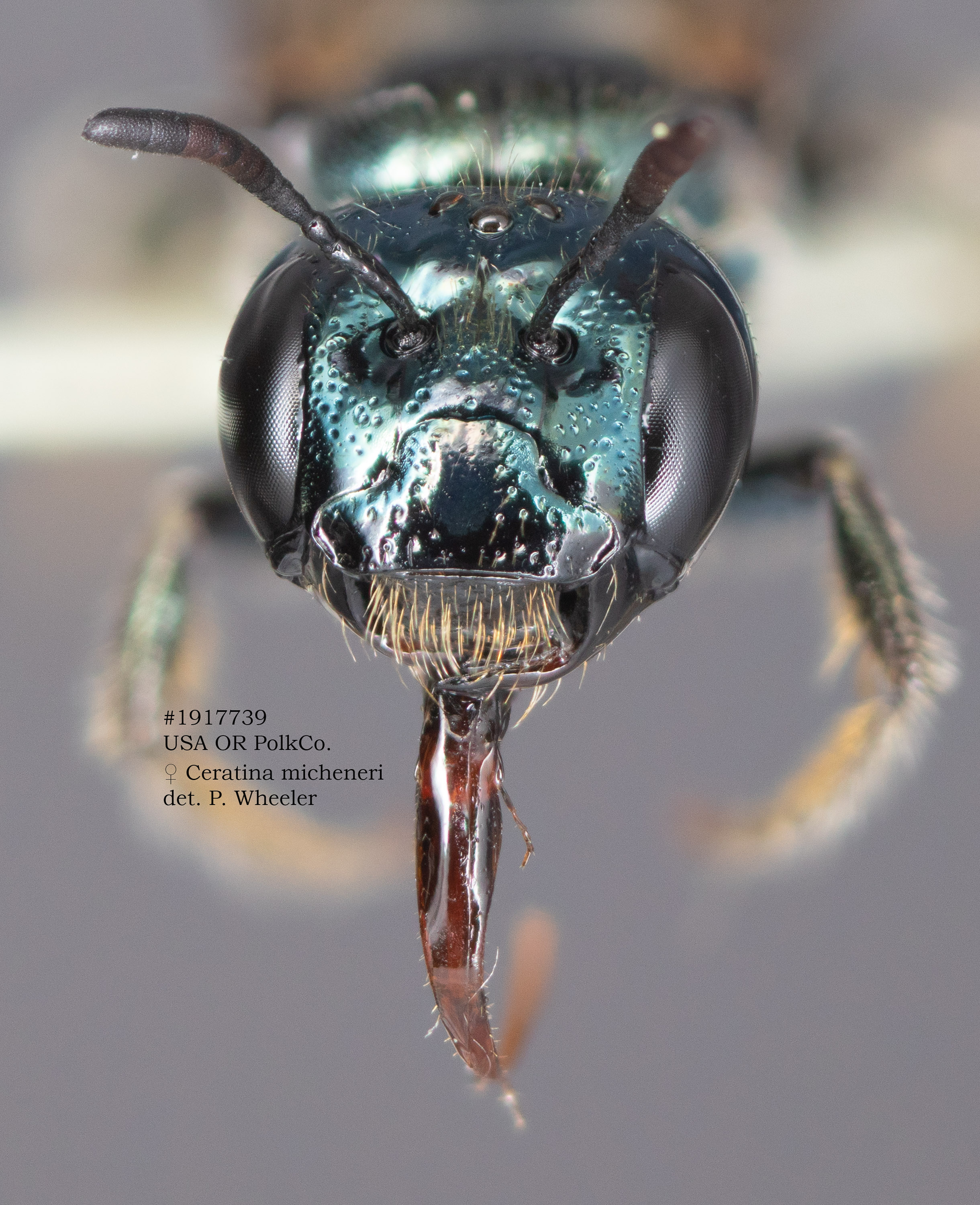 C. micheneri from OR Bee Atlas collection: compare to pic above. The stronger bluer shade is a C. micheneri trait. Clypeal mark absent. The pit distribution appears different.
