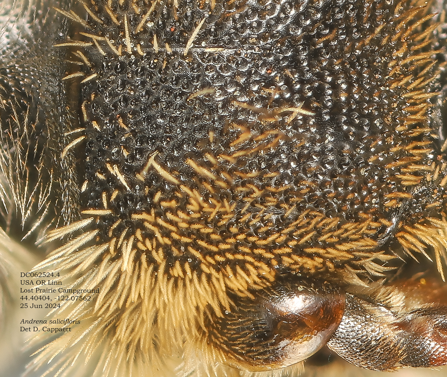 Andrena salicflorisProbably. I include the scutum image at right, which should decide the couplet in the LaBerge key: mesoscutum with anterior third with punctures crowded, separated by mere ridges; vertex above lateral ocellus equals about one ocellar diameter ... salicifloris Cockerell (in part) Mesoscutum with anterior third with punctures discrete, separated by half to almost one puncture width; vertex above lateral ocellus usually distinctly longer than one ocellar diameter .... . miranda Smith (in part). Vertex height is no more than 1 ocd.