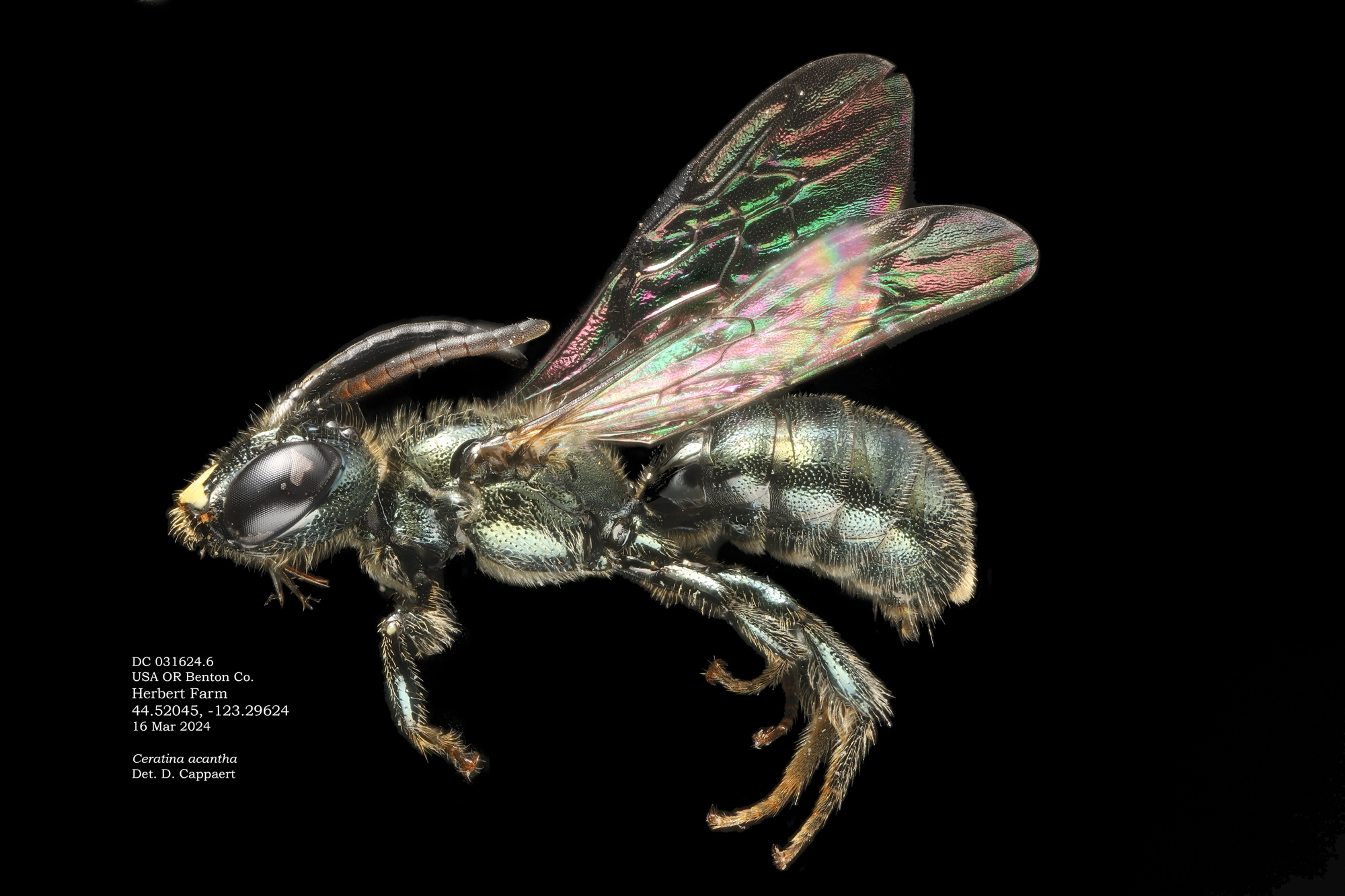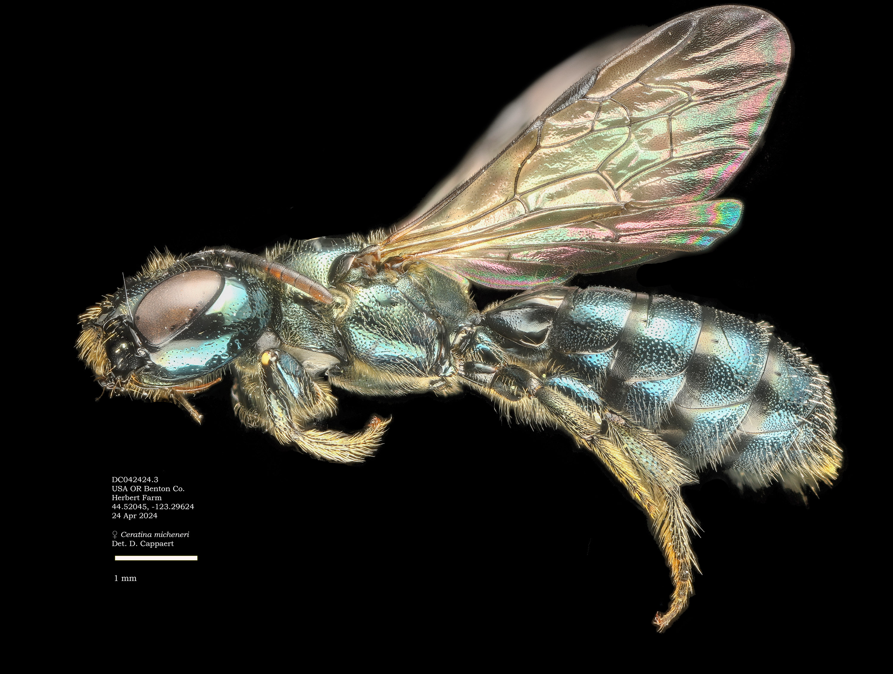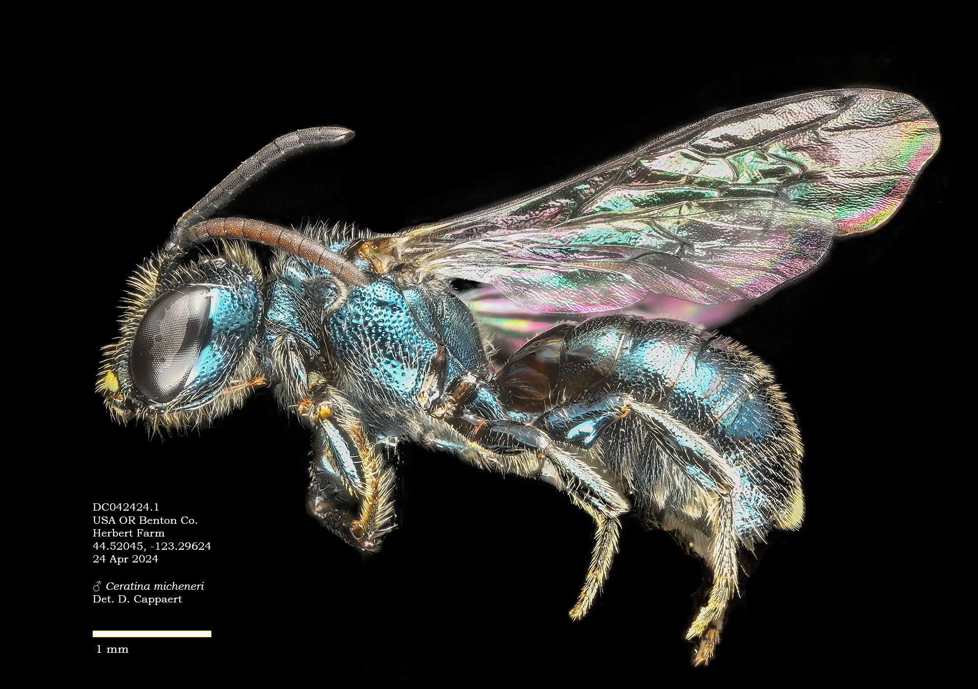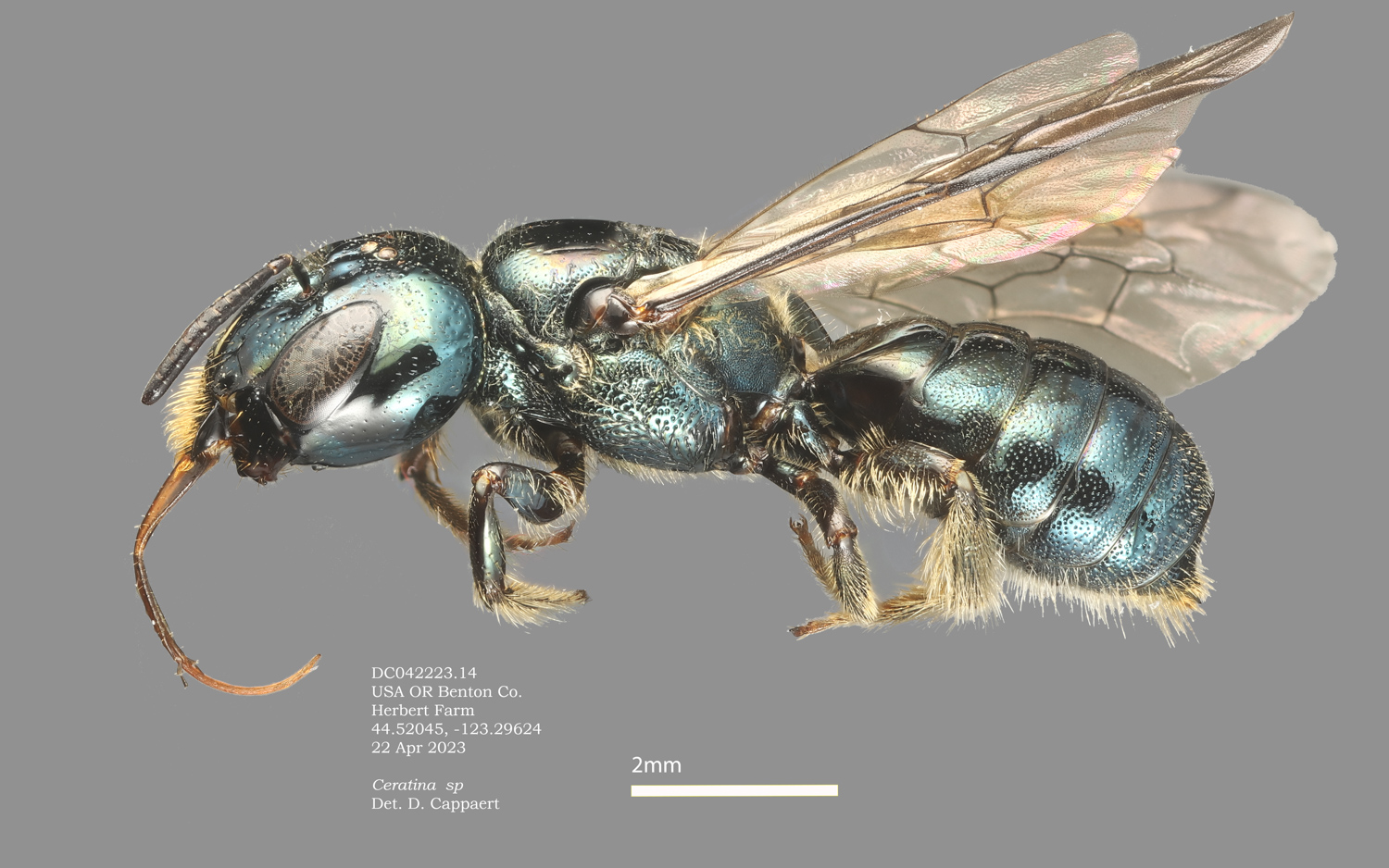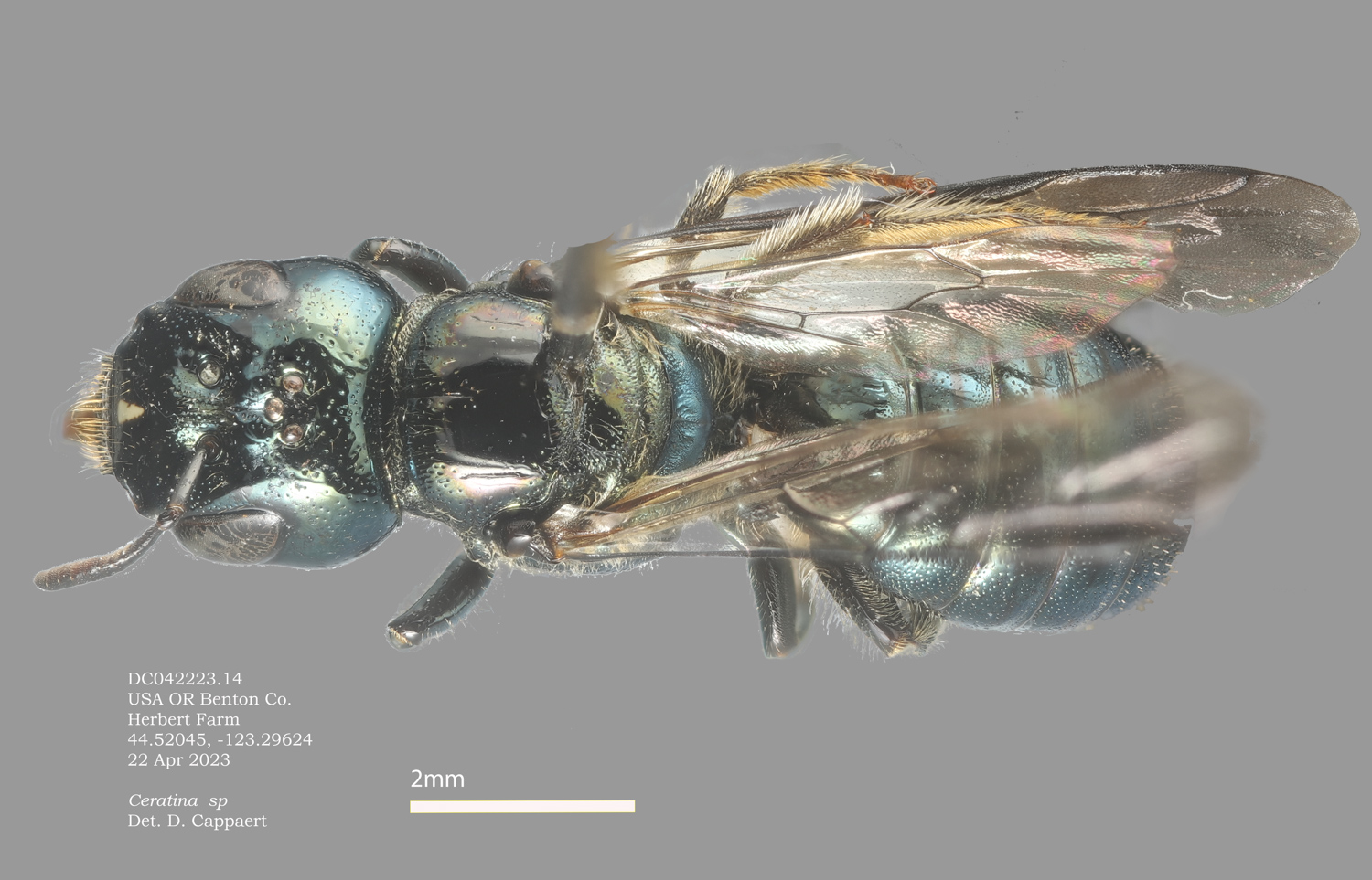 March 2024. I don't pay much attention to Ceratina in western Oregon. They are hyperabundant. They are almost always one species, C. acantha. Rarely, I see one of the other local species (micheneri, naniula). When I collected the Ceratina below a year ago, I noticed at the time that it was exceptionally big. Sorting specimens recently, I noticed the size again, so looked closely. Ceratina tejonensis. Northernmost record for this species, to my knowledge. One always wonders these days ... climate change?
