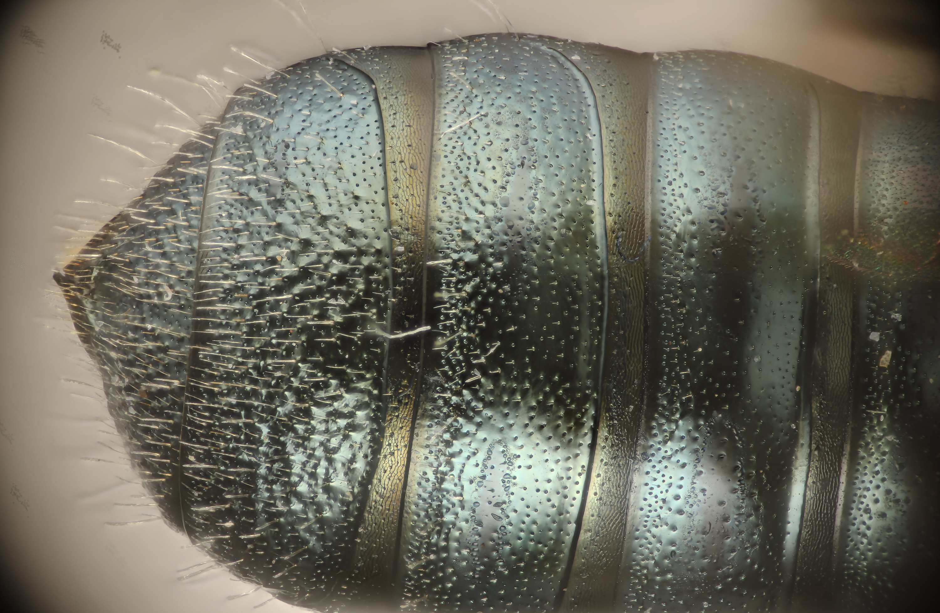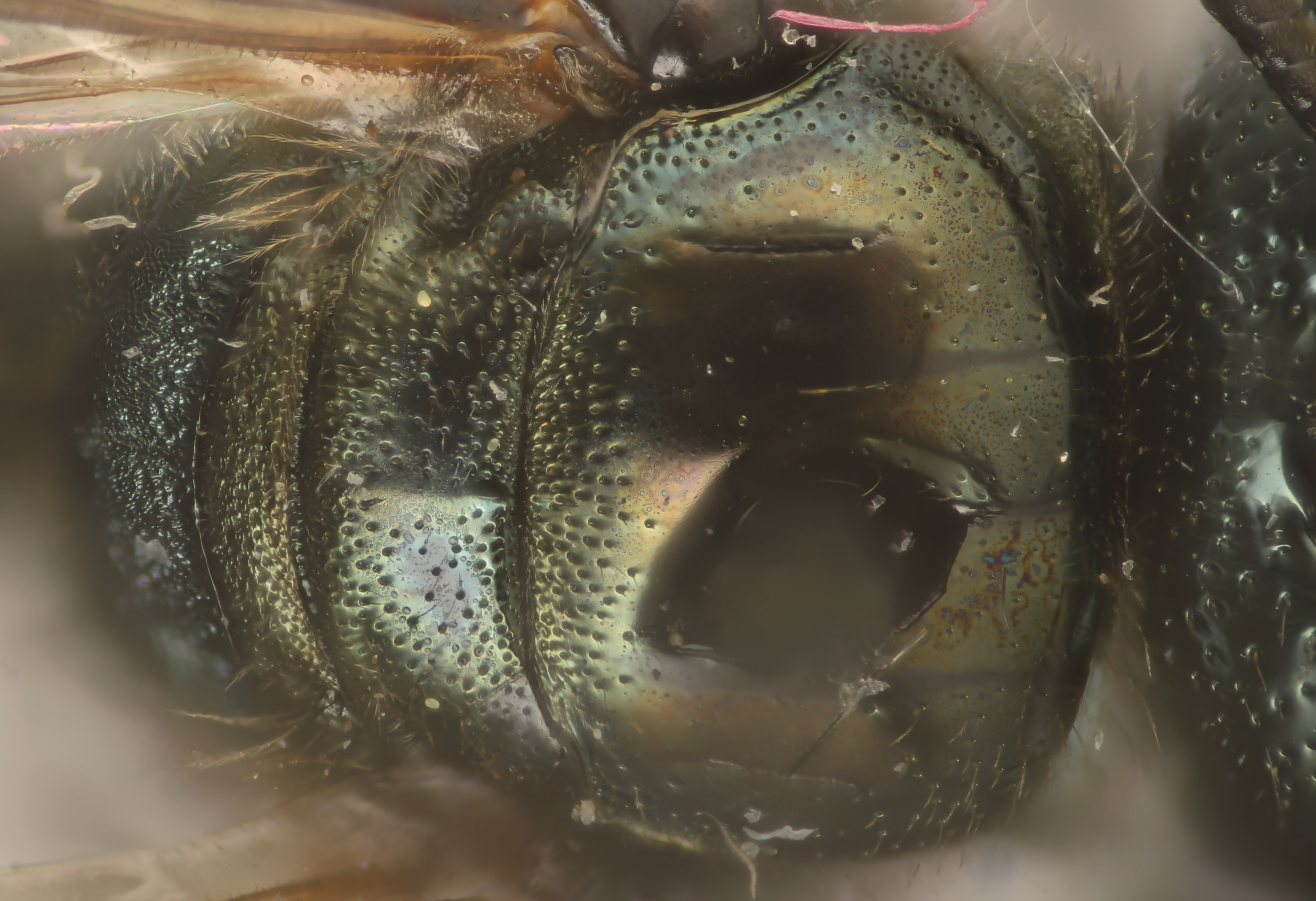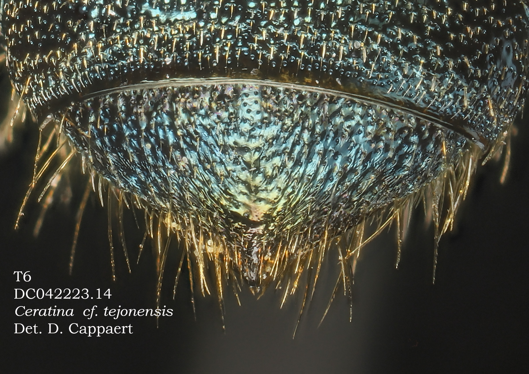 From the Daly key. C. micheneri female: median area of 6th tergum broadly convex, the surface minutely roughened, glistening only near central dish-shaped area which may be non-