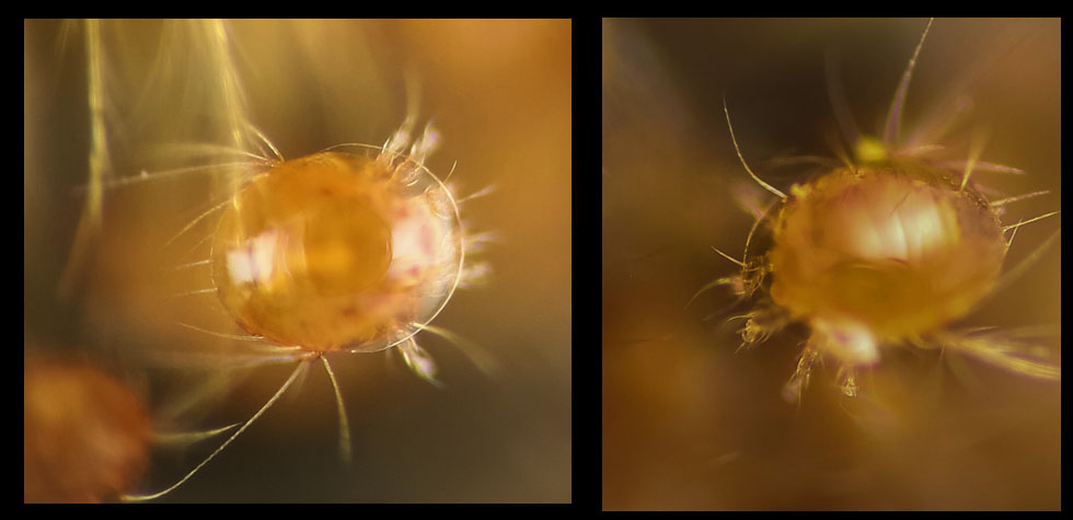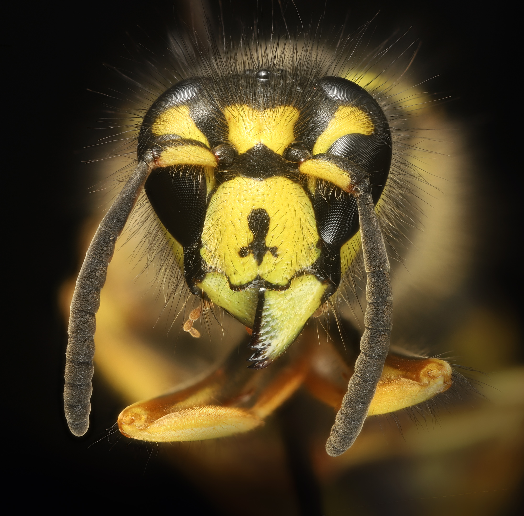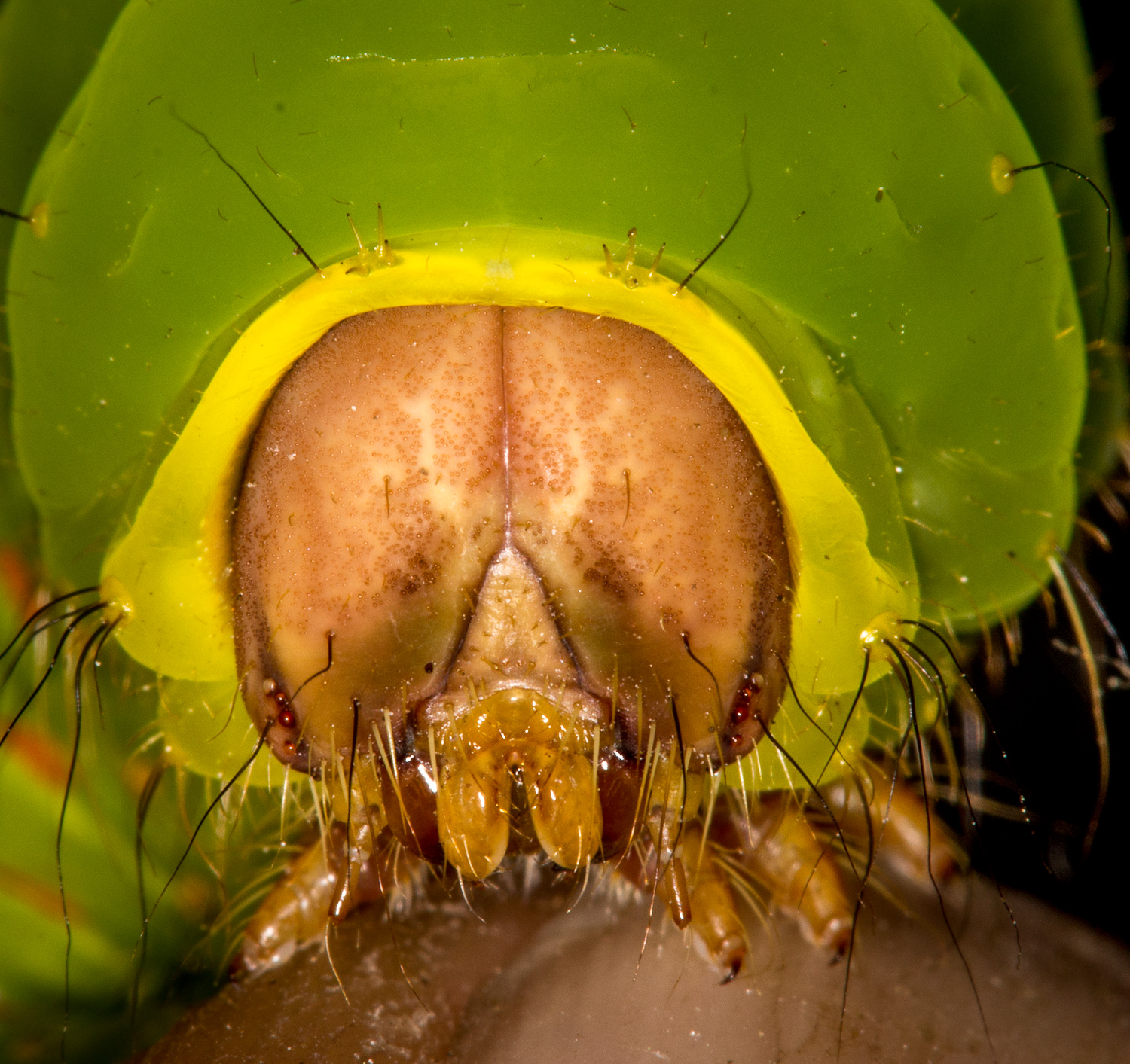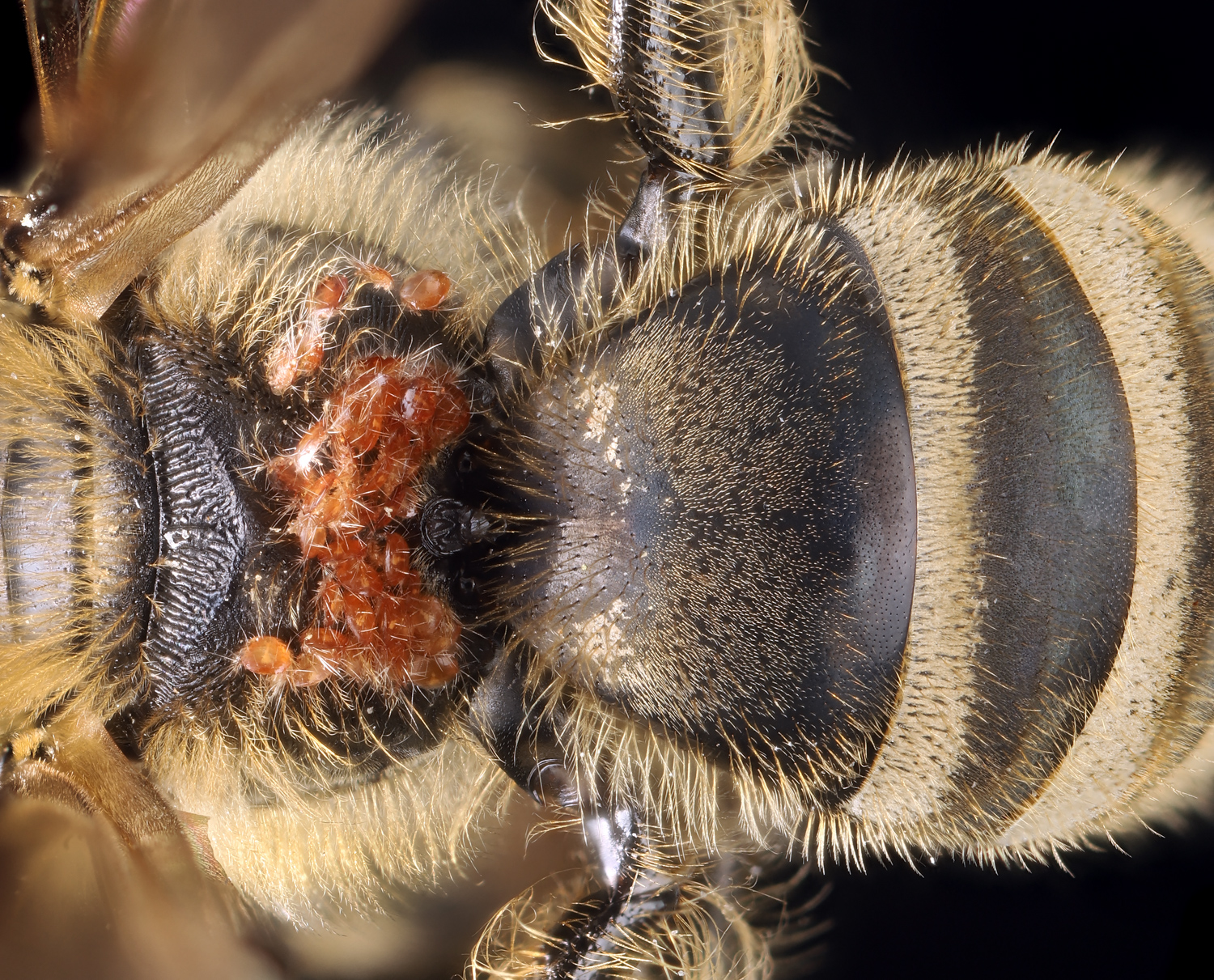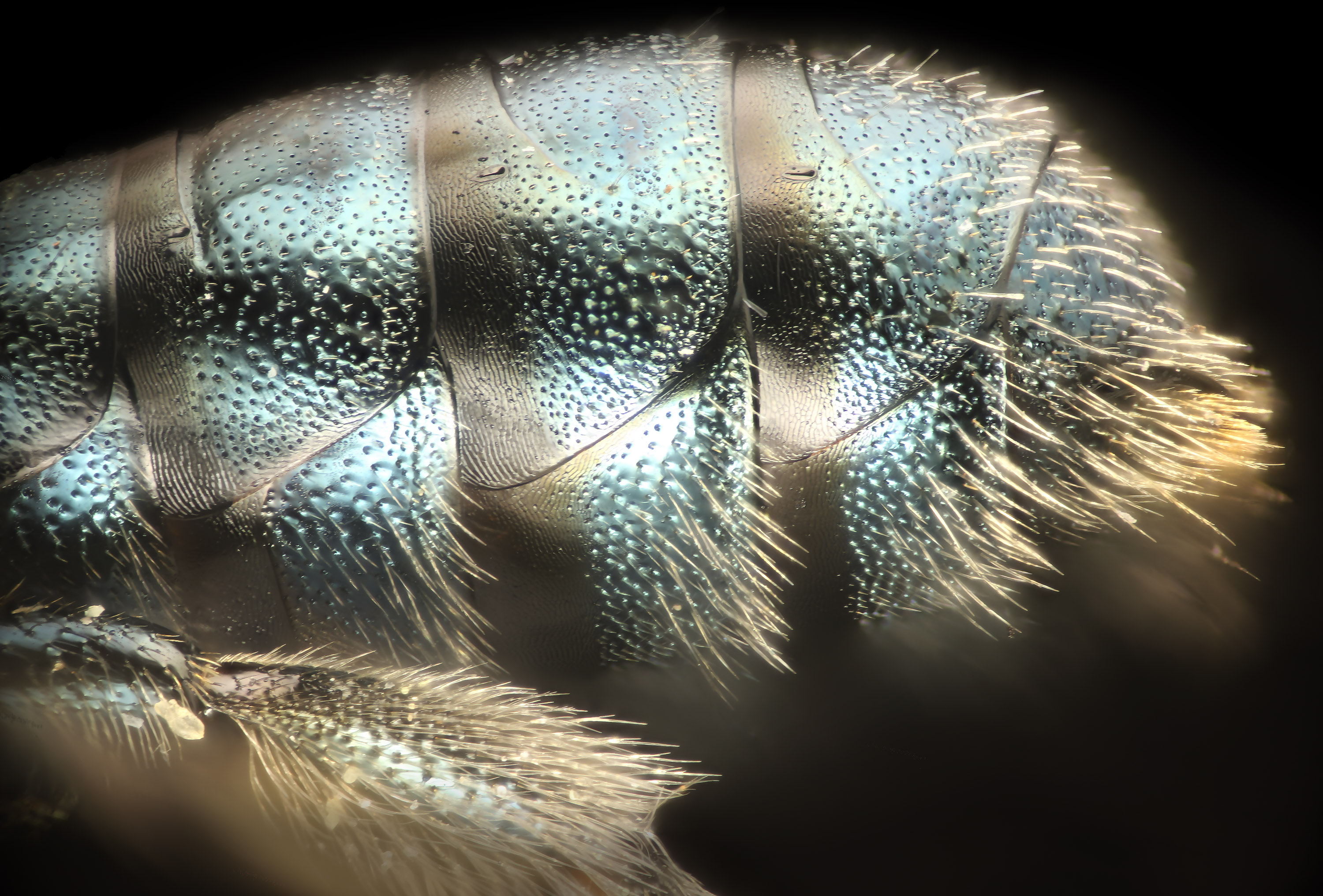 Above: mandible of bee at left, shot wwith 10X microscope lens. Below: opposite mandible of same bee, shot with 65mm Canon MPE lens.