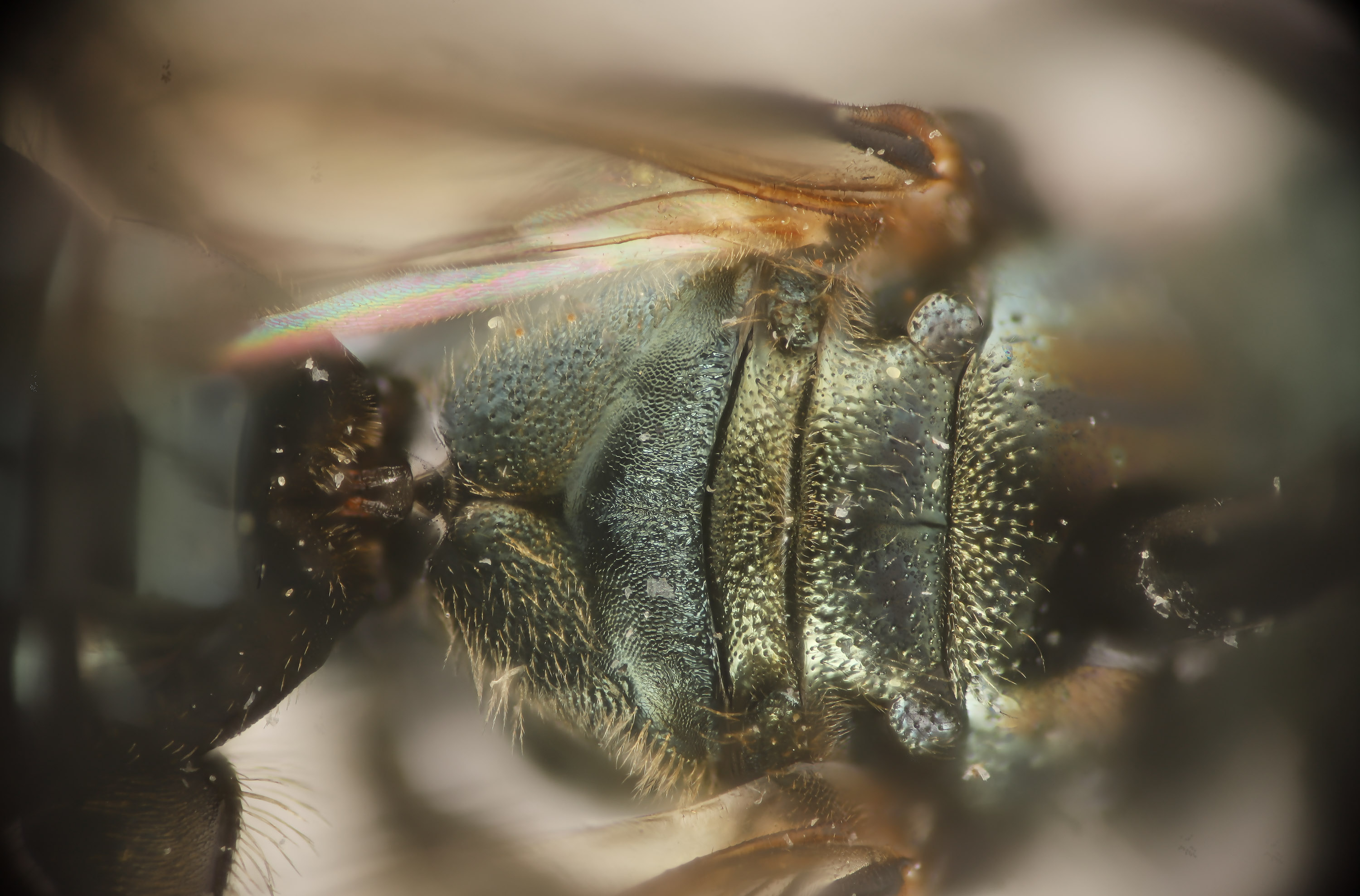 Compare: Two additional specimens, collected at the same site on the same day also mostly fit nigrocaerulea. That's probably the right ID, but the hairs are off. Episternum, tergae, vertex, clypeus all light, whereas dark is expected for nigrocaerulea. Also, integument lighter, greener.