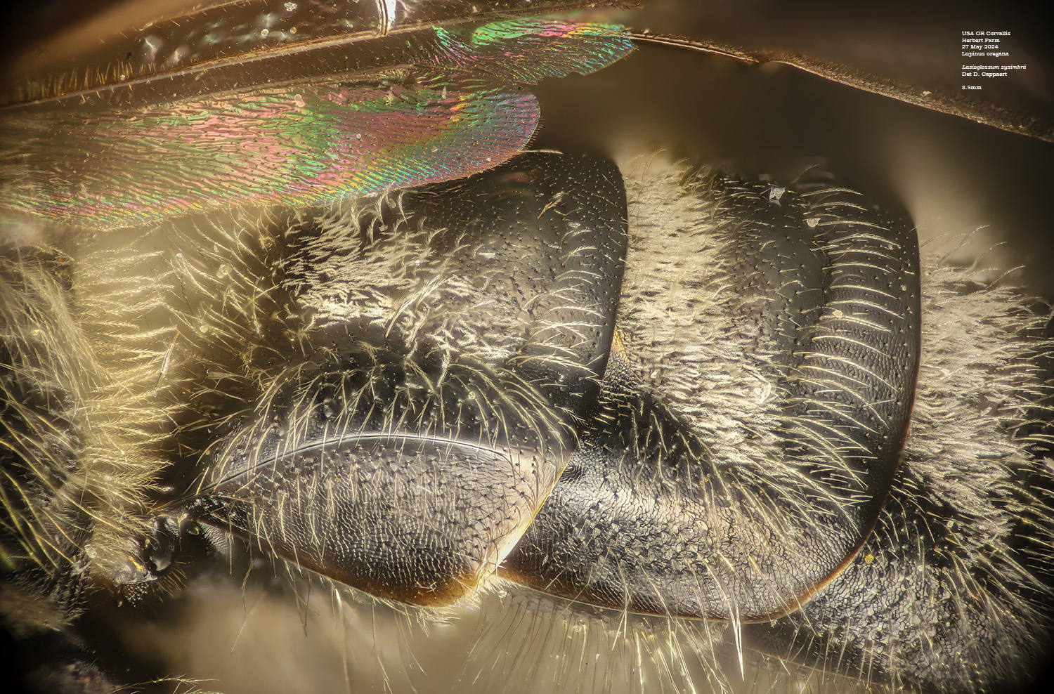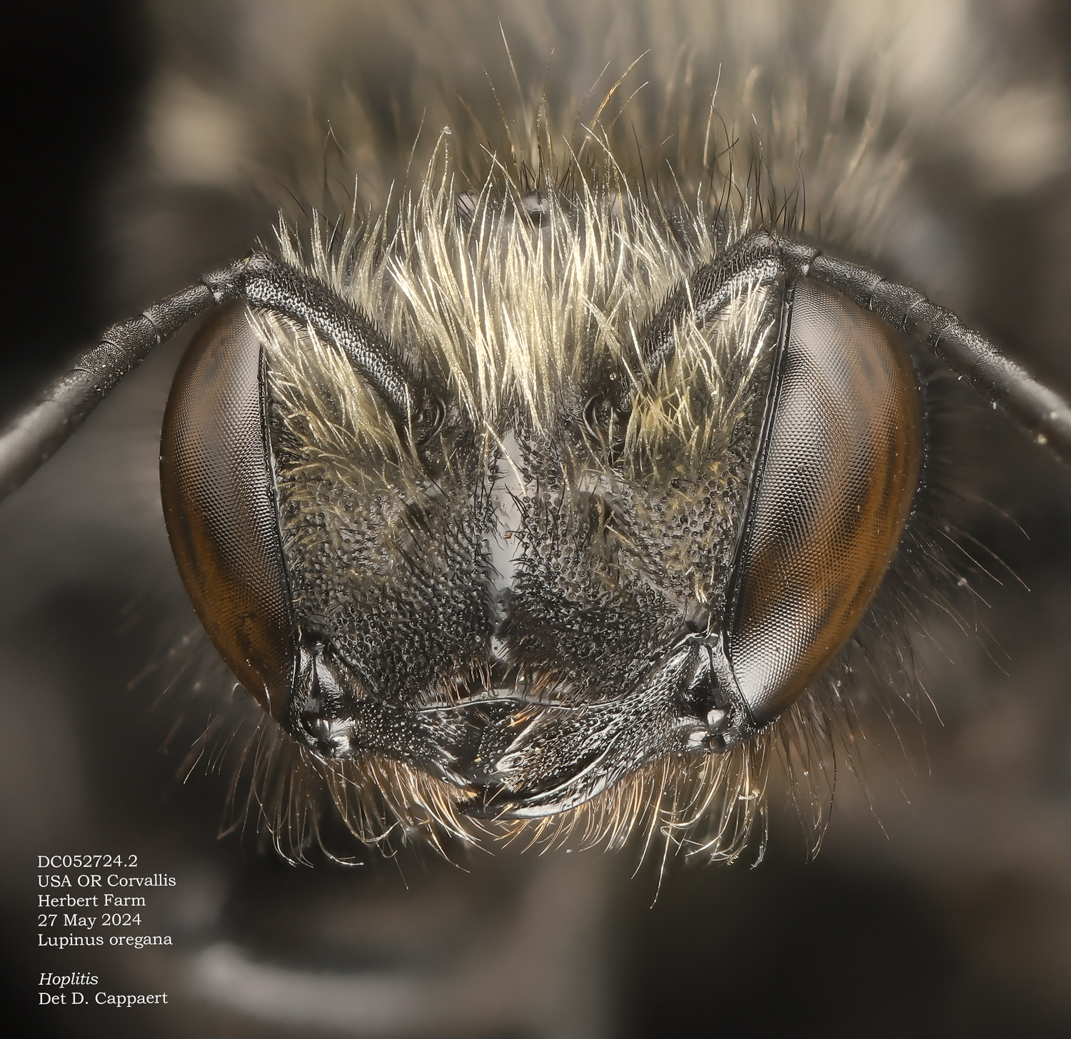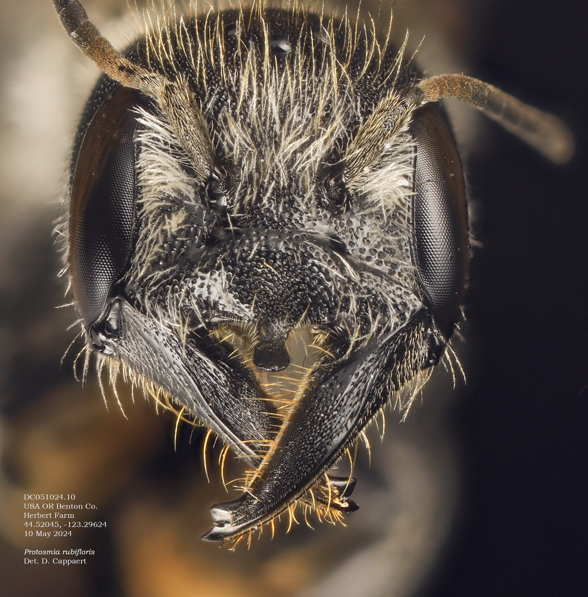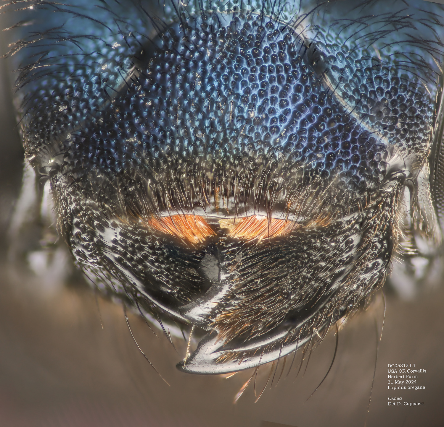 Face of Protosmia rubifloris, with its decussate mandibles. River lupine.