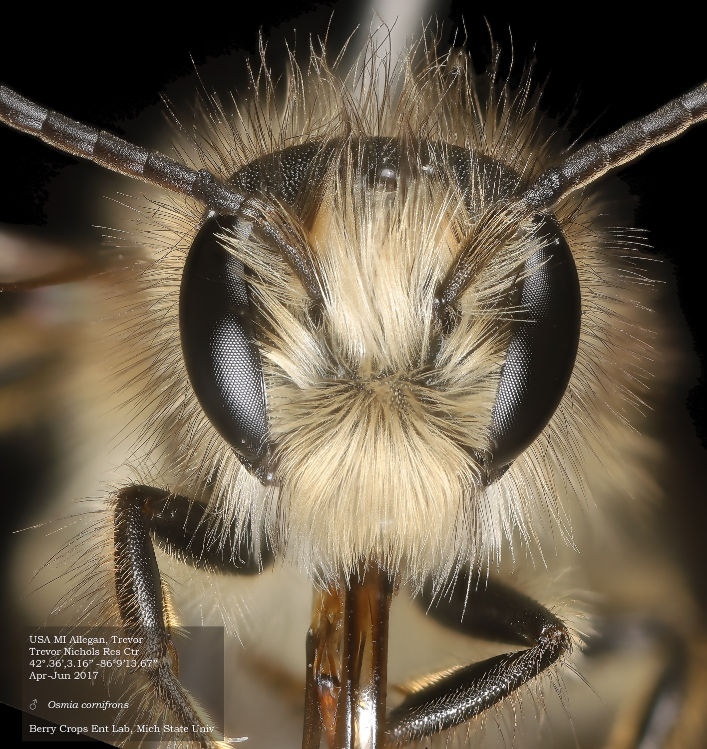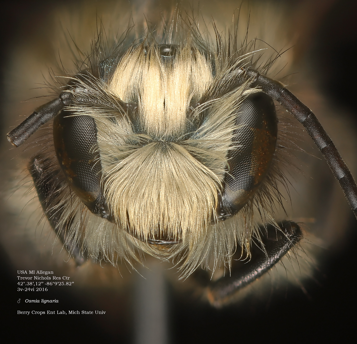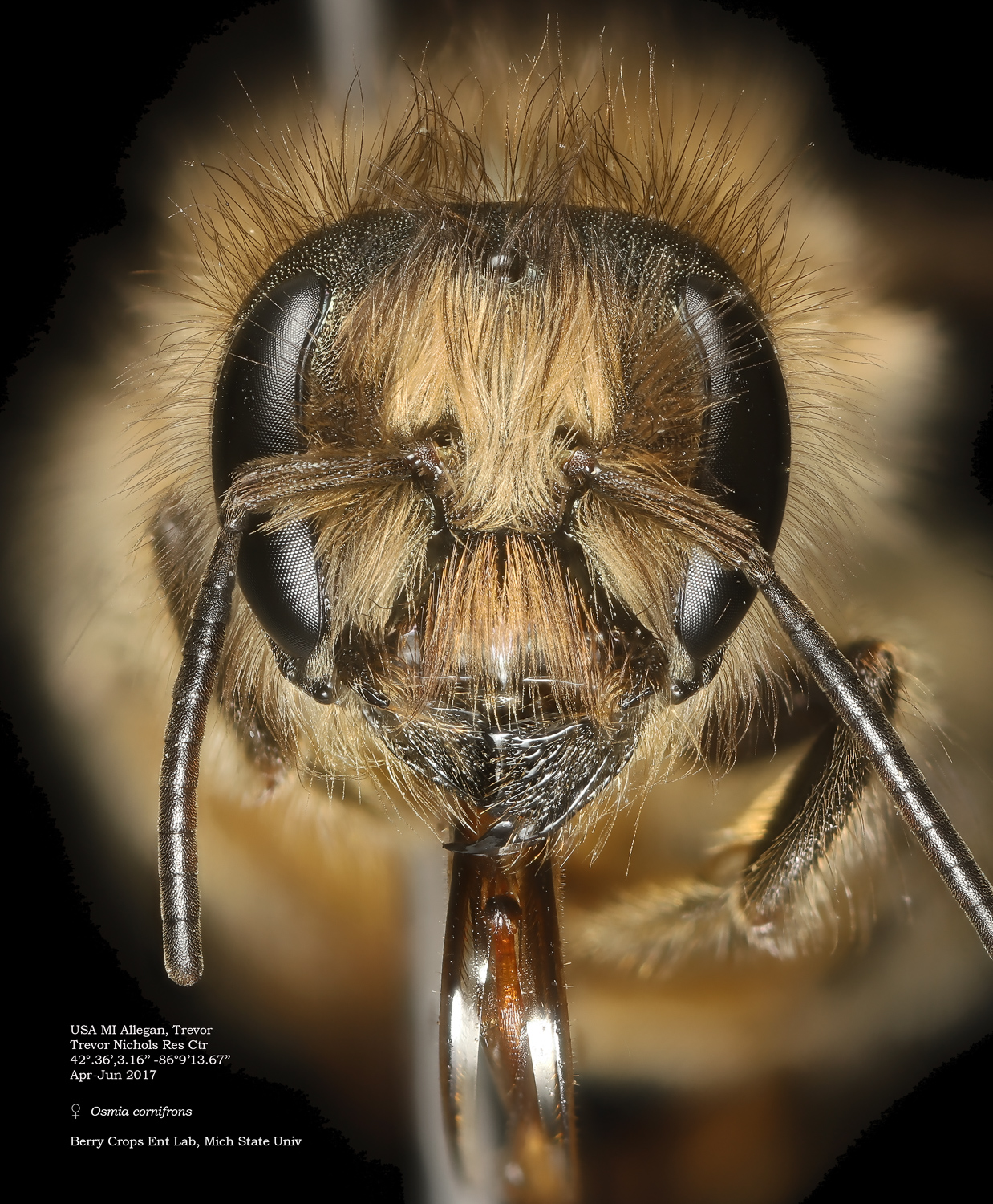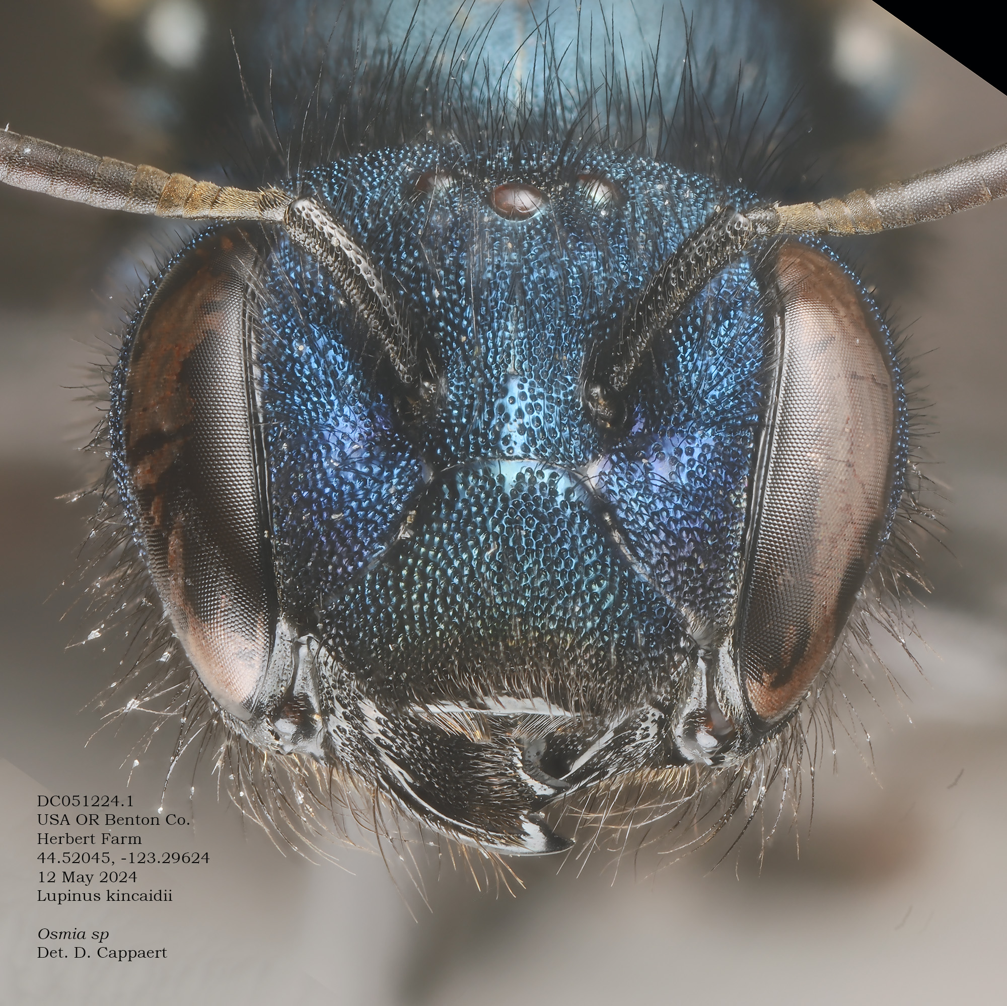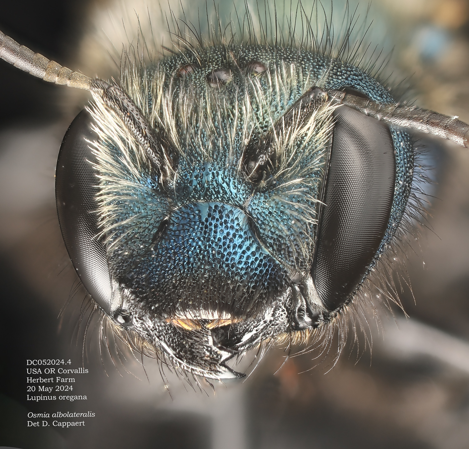 Face of Protosmia rubifloris, with its decussate mandibles. River lupine.
