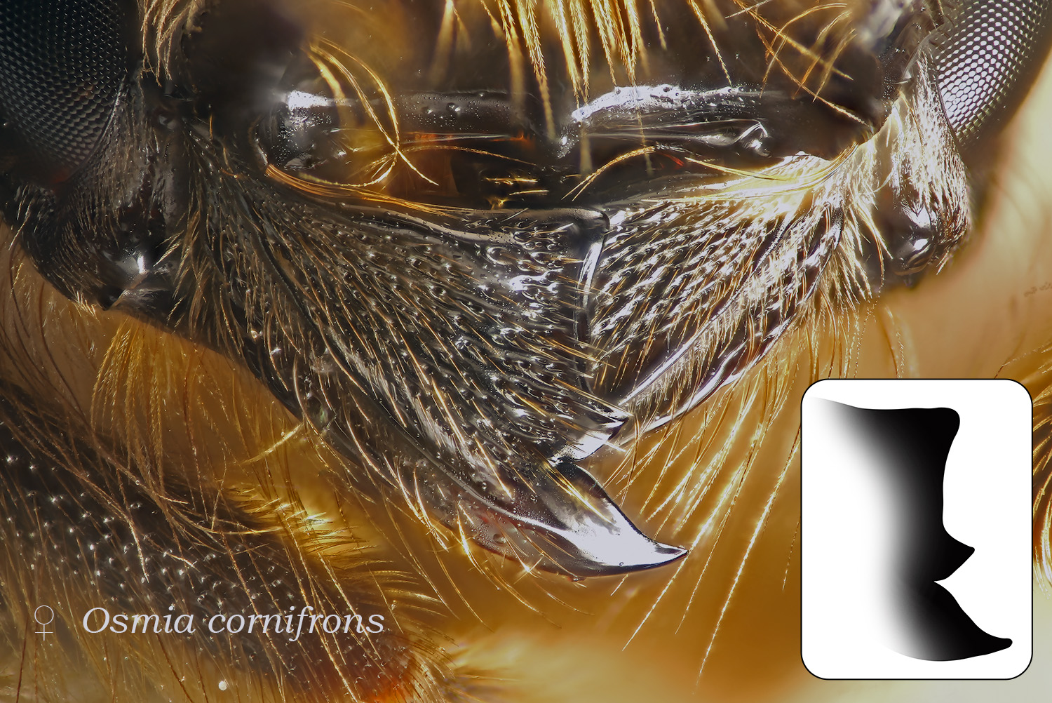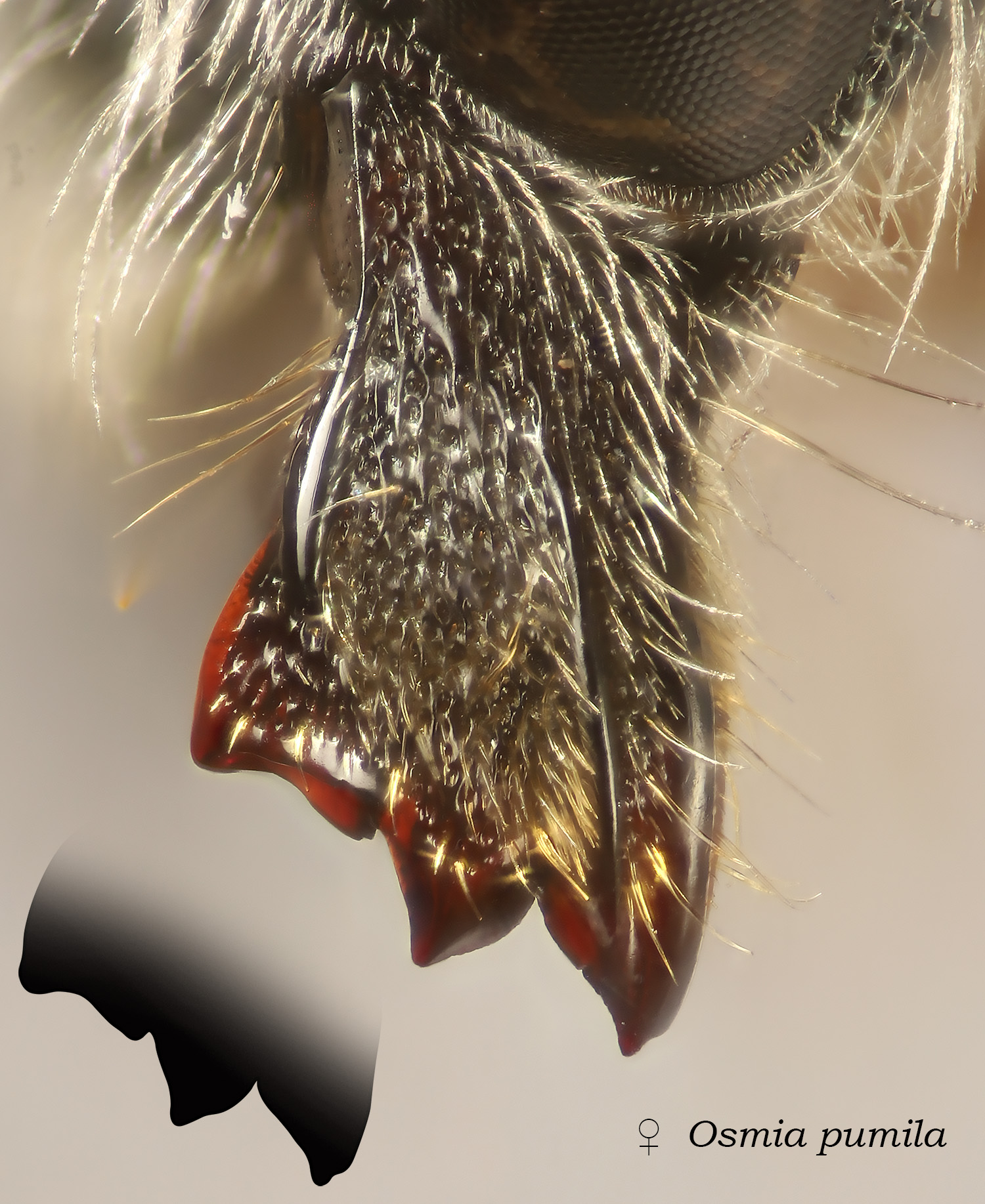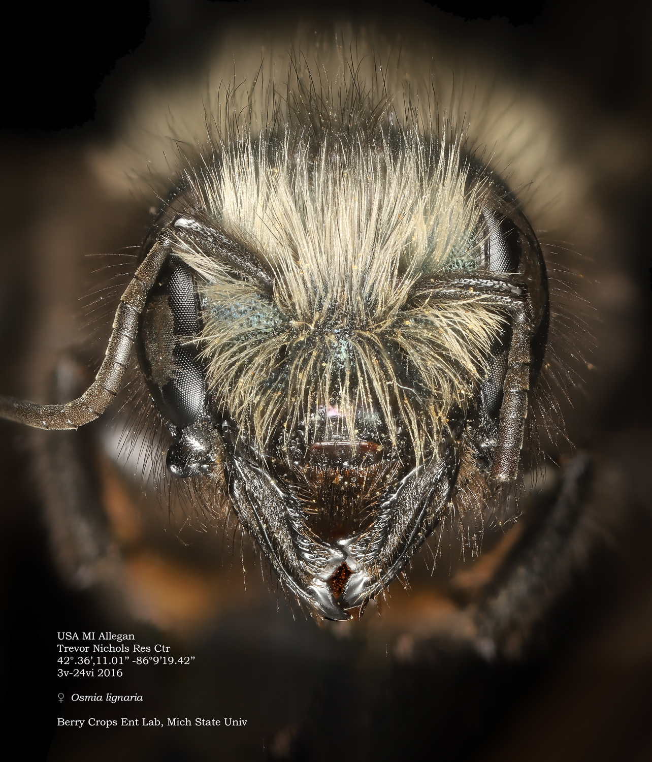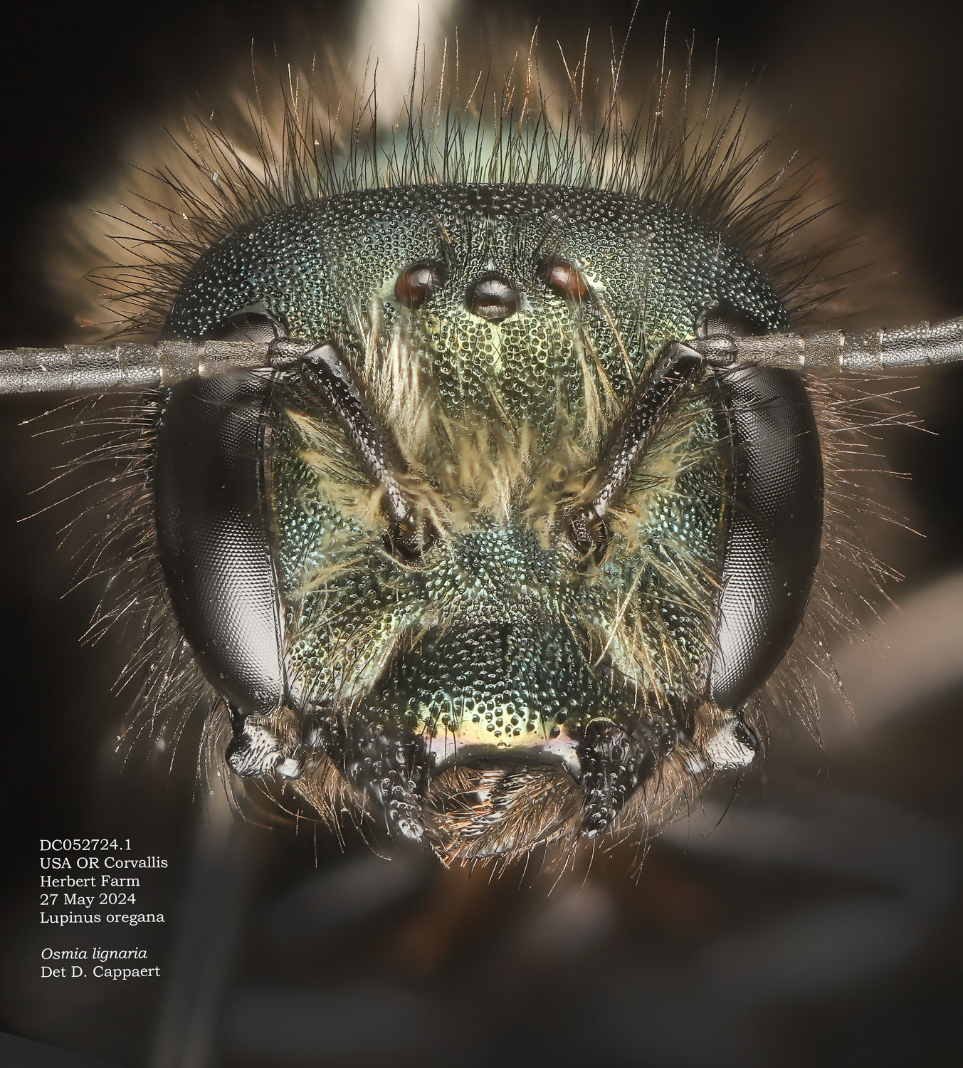 Face of Protosmia rubifloris, with its decussate mandibles. River lupine.