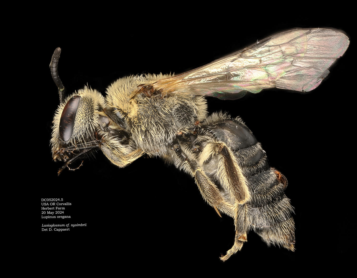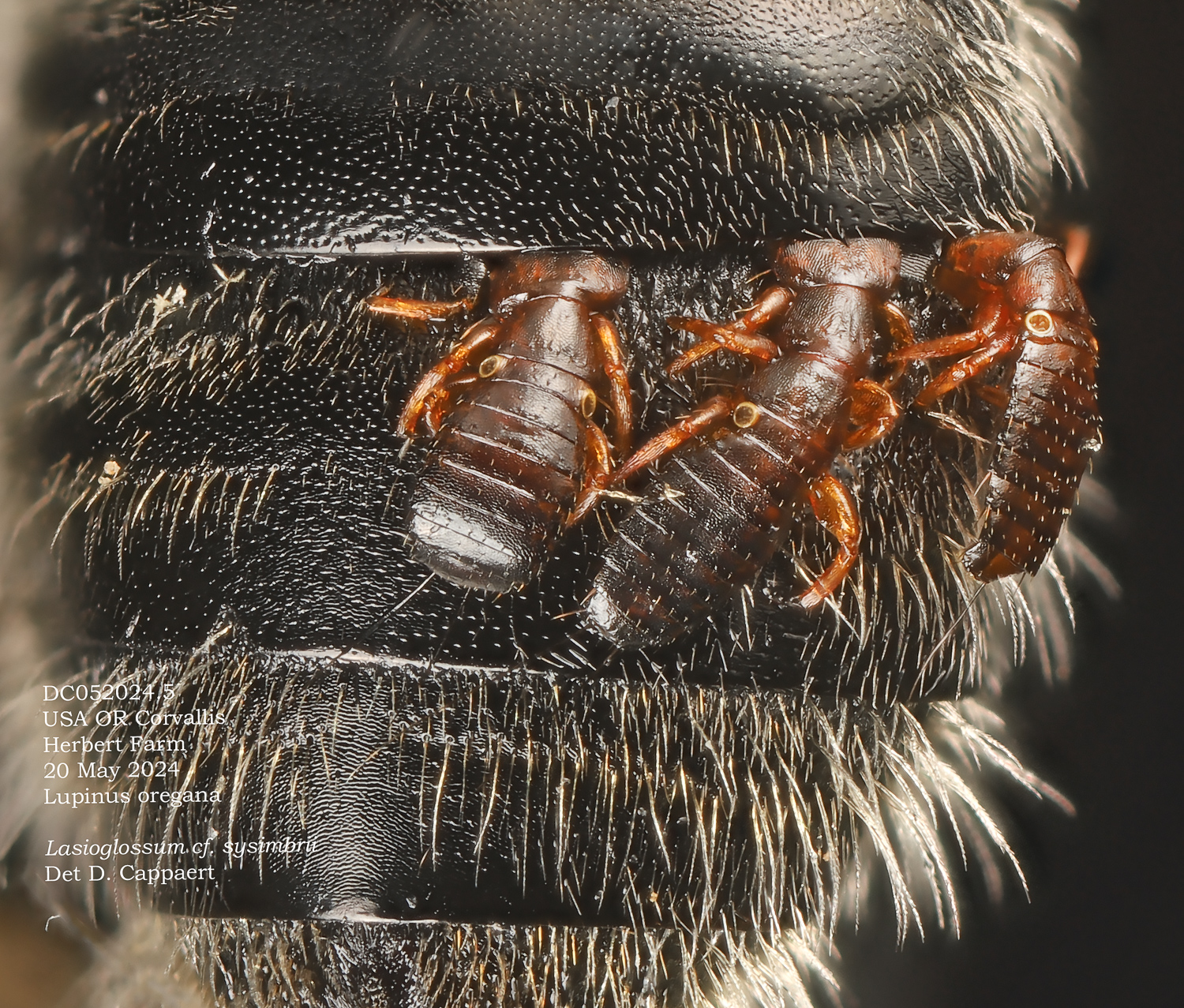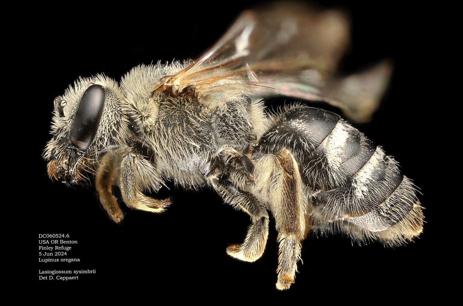 Lasioglossum sysimbriiL. sysimbrii exhibits white hairs and a distinctive T1 hairband--when it hasn't rubbed off. I have seen a range from "barely there" to unmistakeable.
