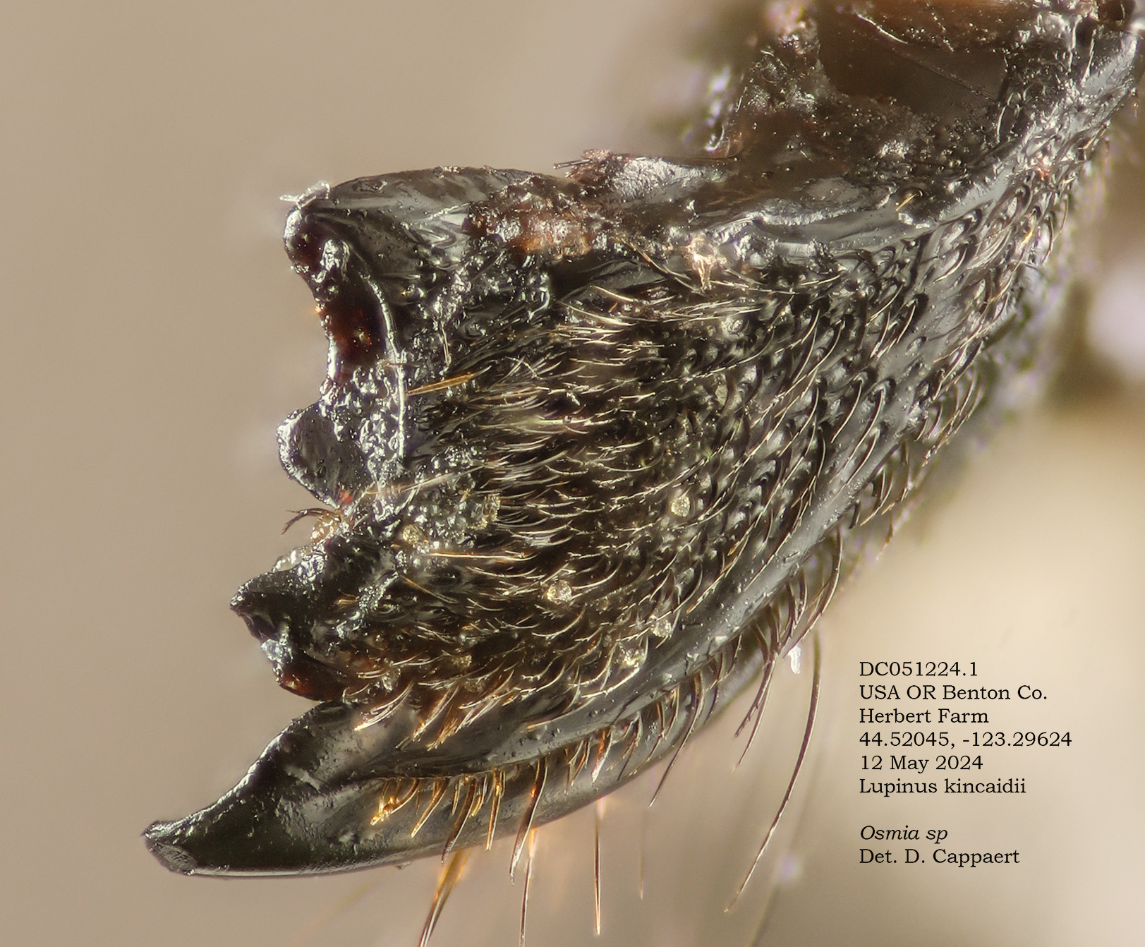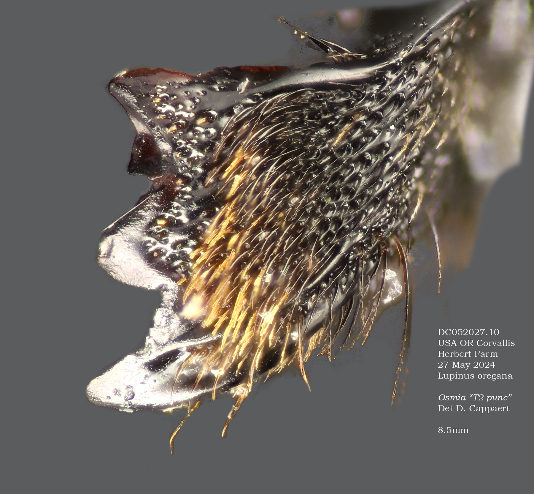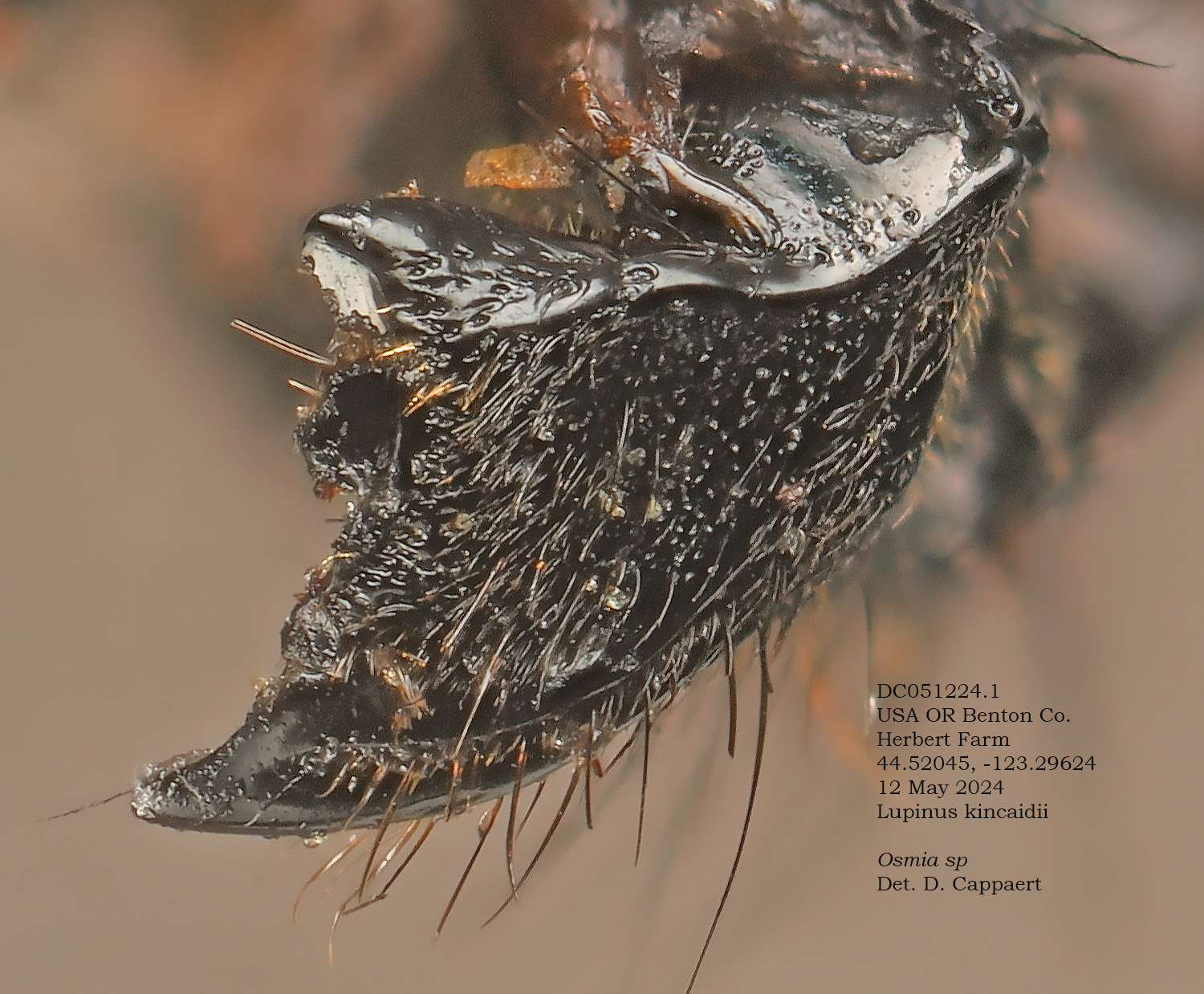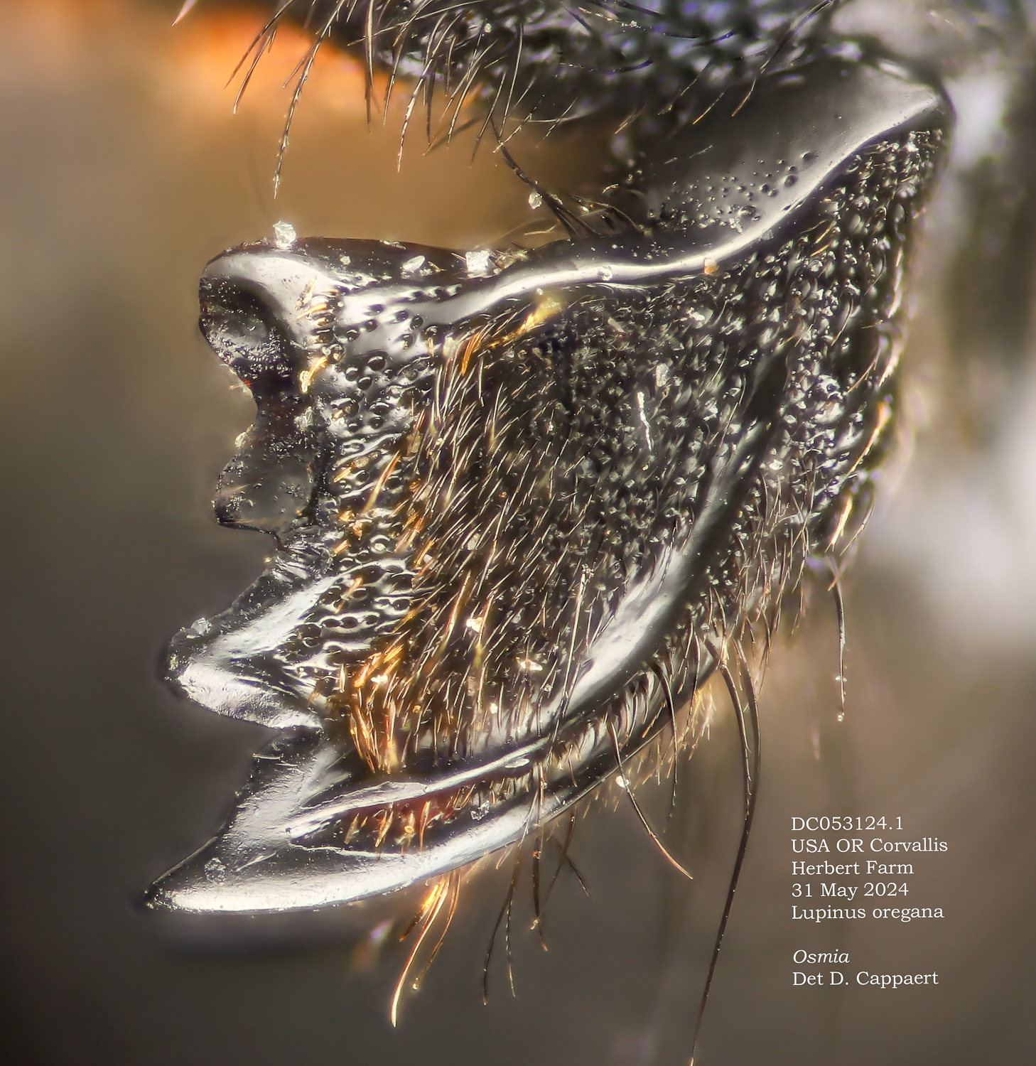 Osmia male, of the (unknown) species that accounted for 5 of 6 Osmia on river lupine. Notable: large spatulate projection from S3.