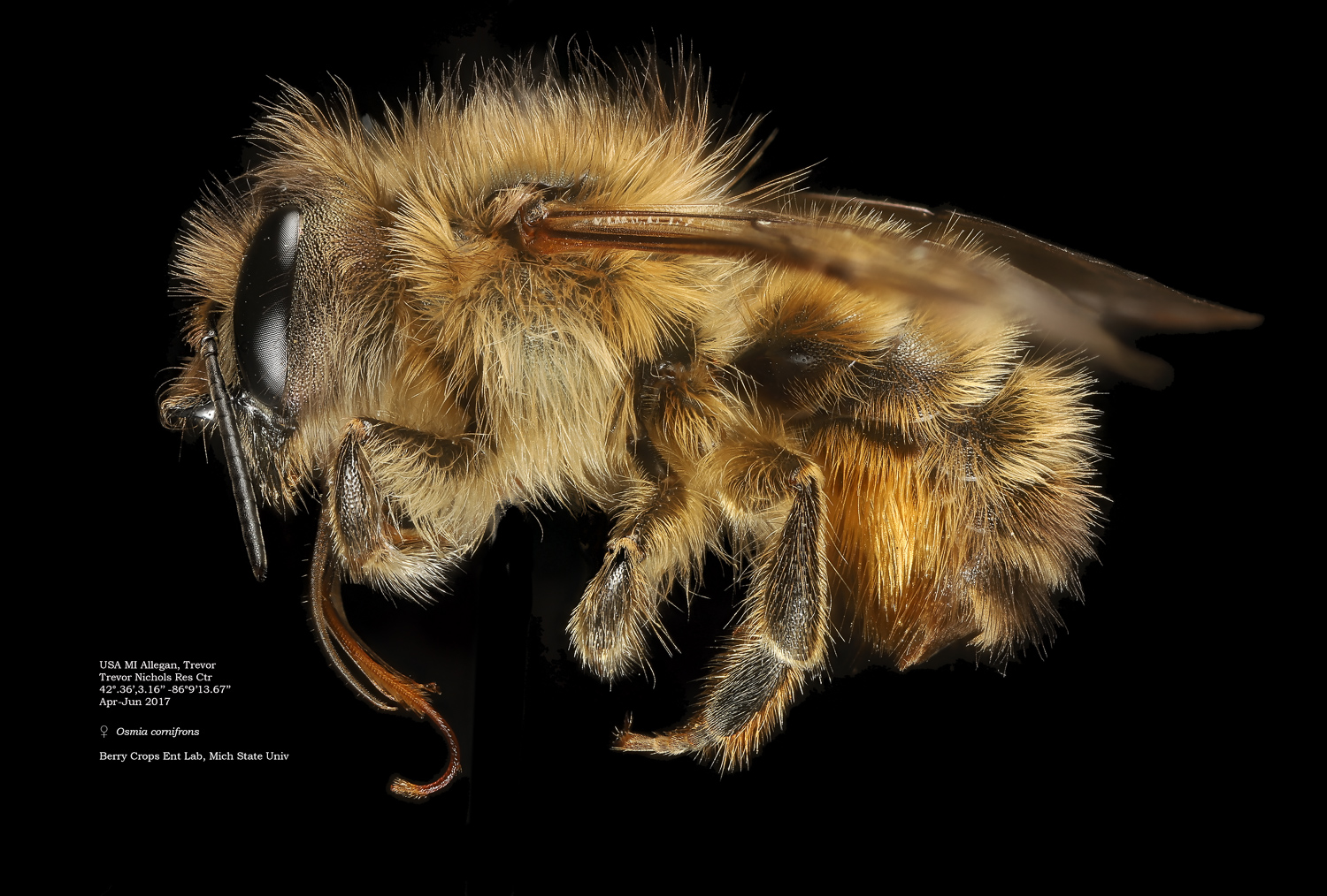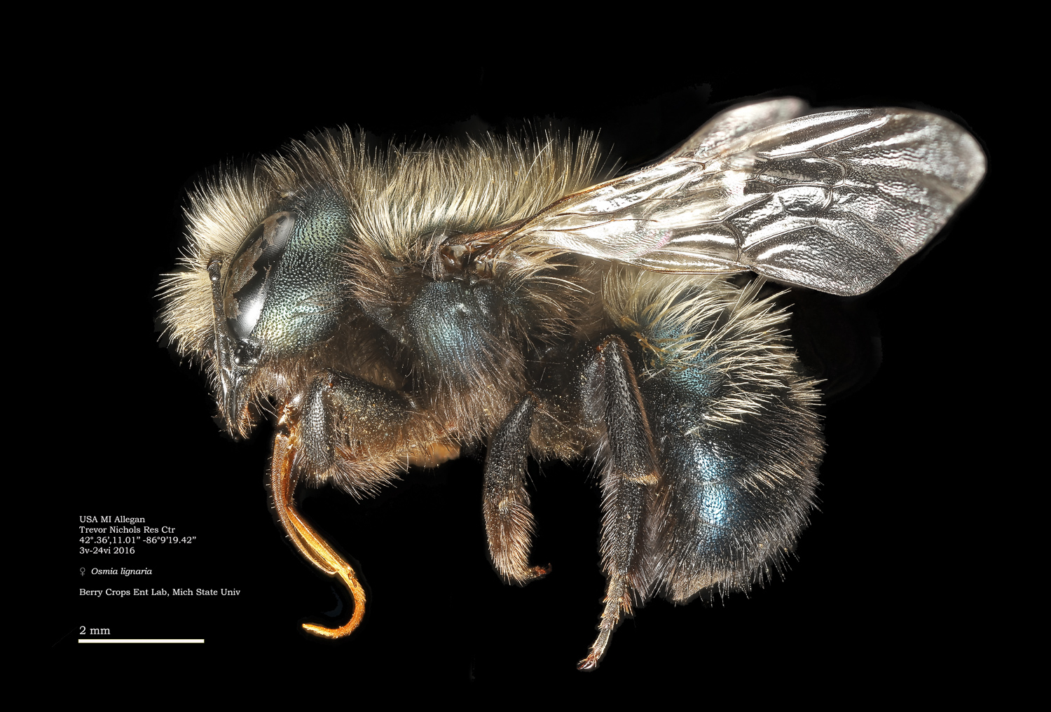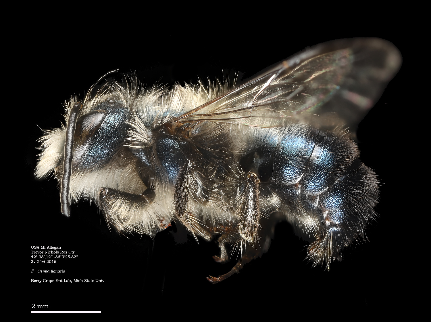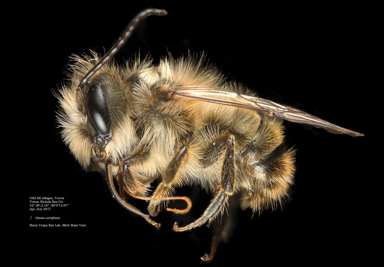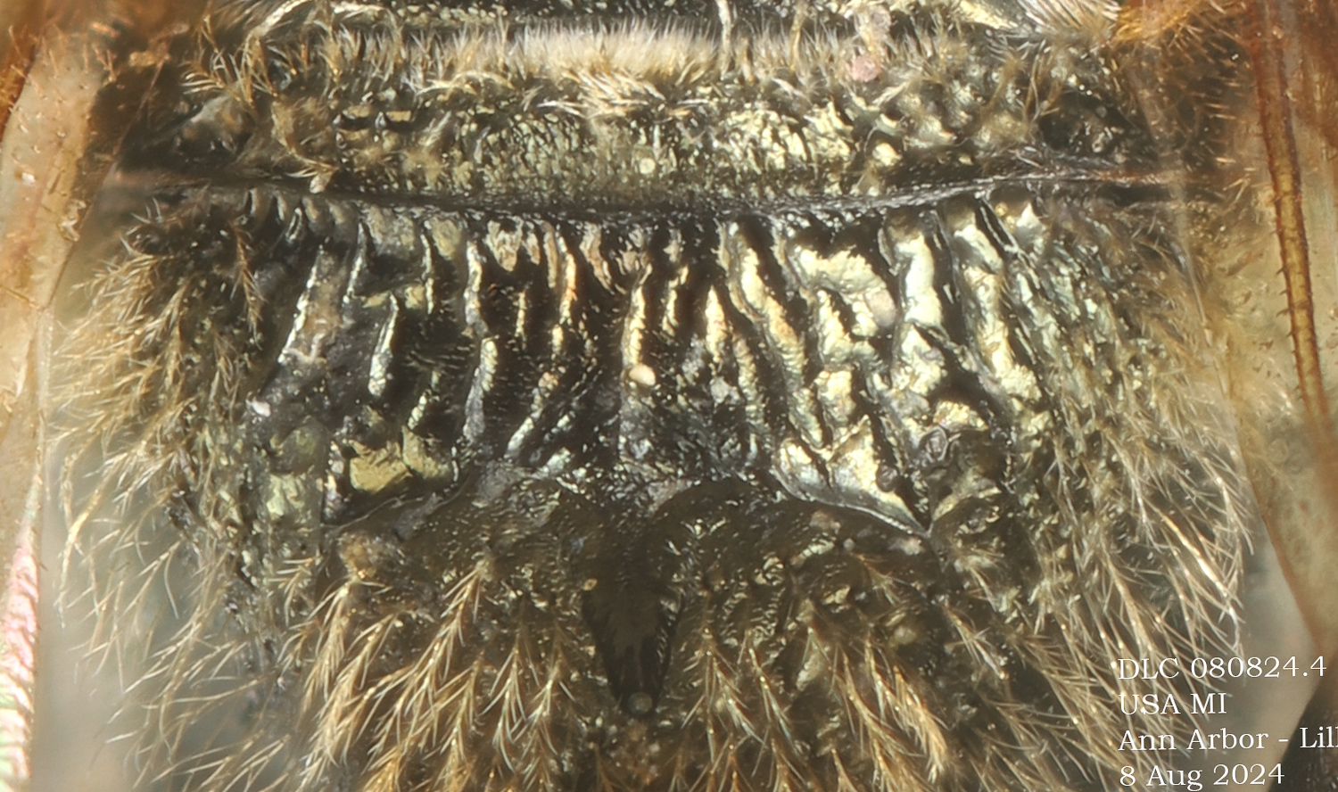Osmia male, of the (unknown) species that accounted for 5 of 6 Osmia on river lupine. Notable: large spatulate projection from S3.