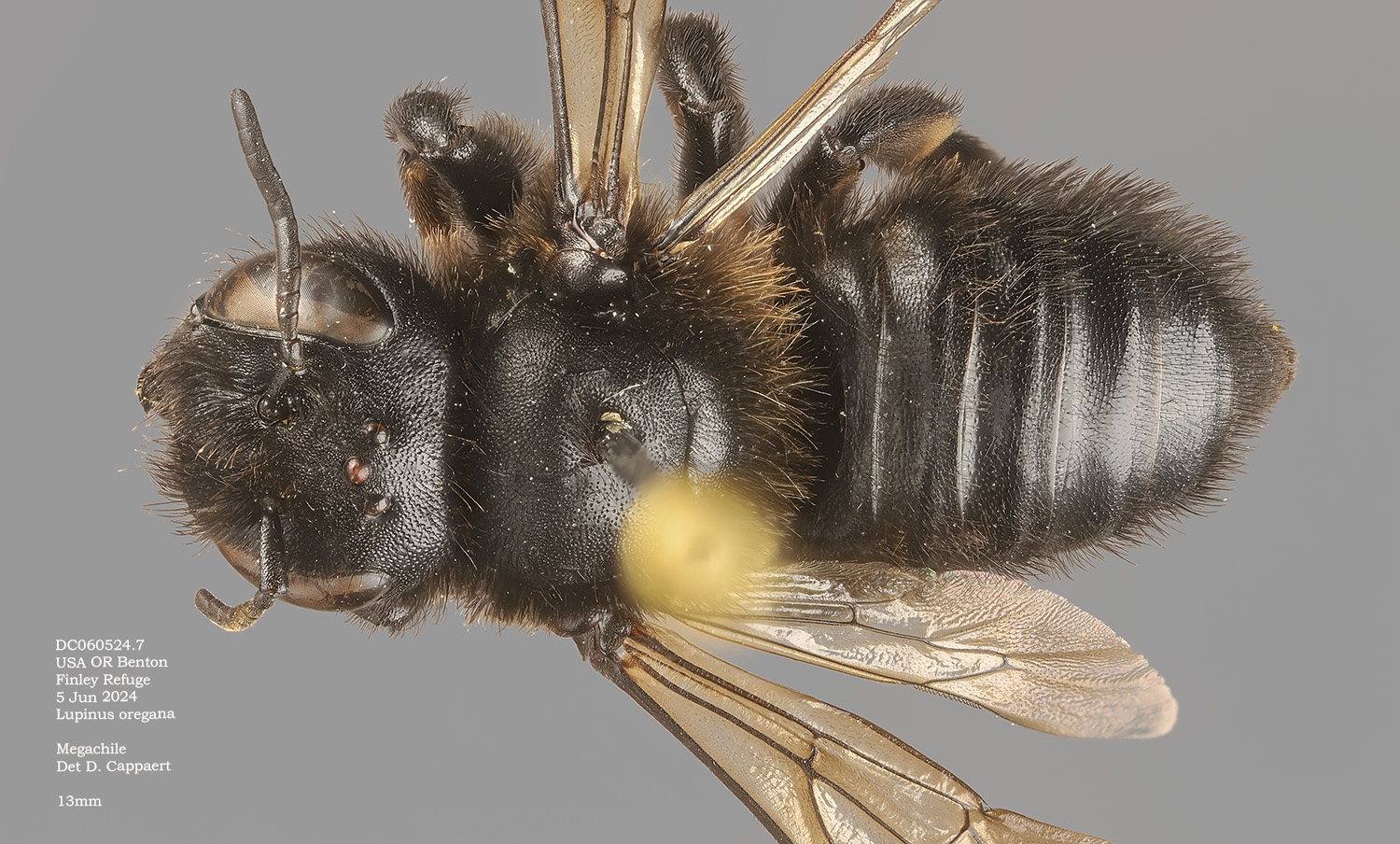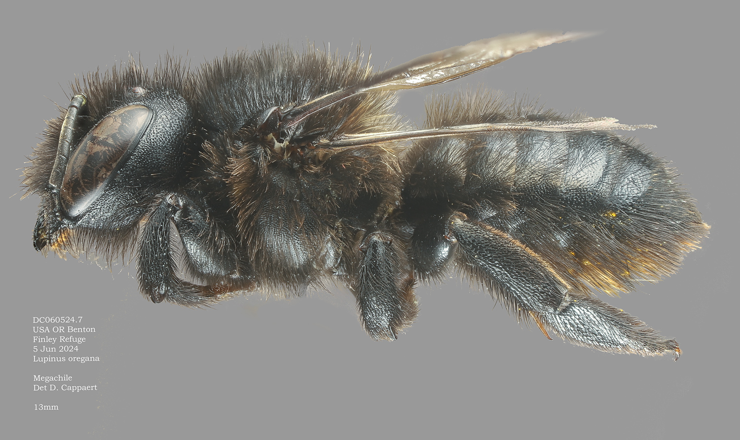 An entirely black MegachileAny western Megachile I've ever seen has white tergal hair bands. The only black Megachile in the US that I find is Megachile xylocopoides, a southeastern species. UPDATE 22 Jun: best guess, and suggested by Jade Lyf, is M. melanophaea. This would be a very dark variant, for which I find no comparable image.