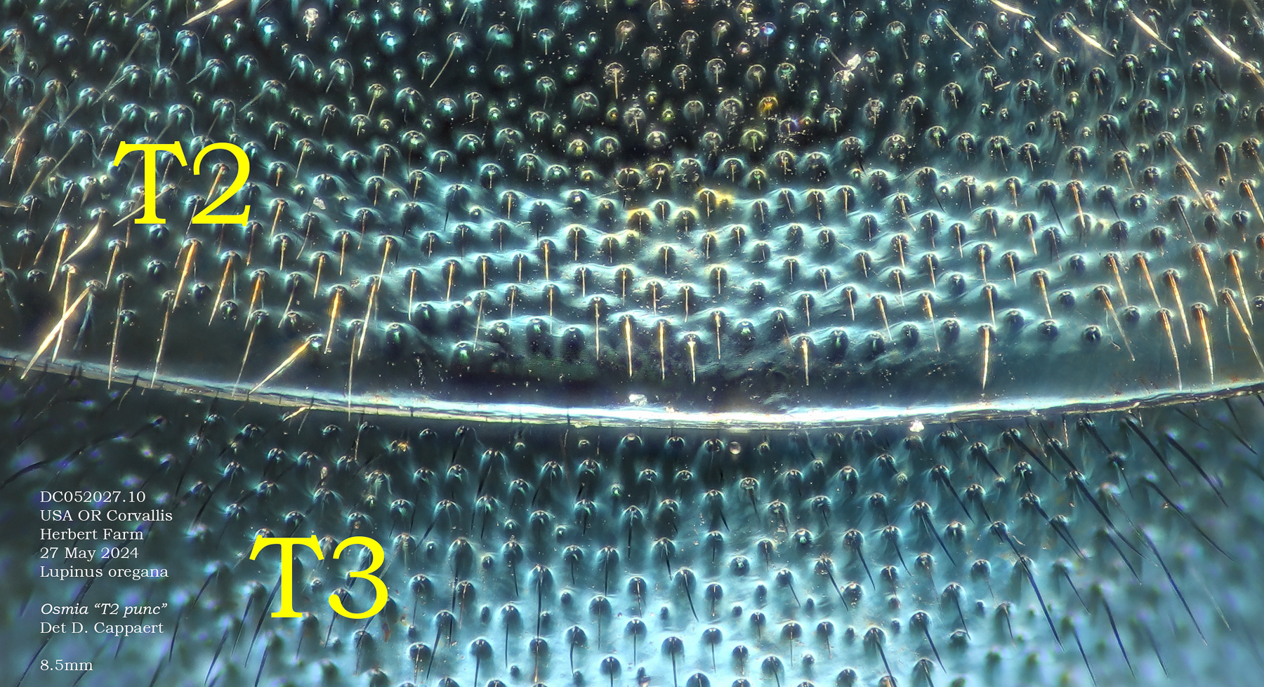 Osmia cyanellaSmall--8.5mm. T2 impunctate to near apical margin, in straight row. Back of head carinate. O. cyanella seems to fit in Rightmyer draft key. Packer image in DL also fits. UPDATE: Molly Rightmyer suggestsn O. cyanella based on the images. |