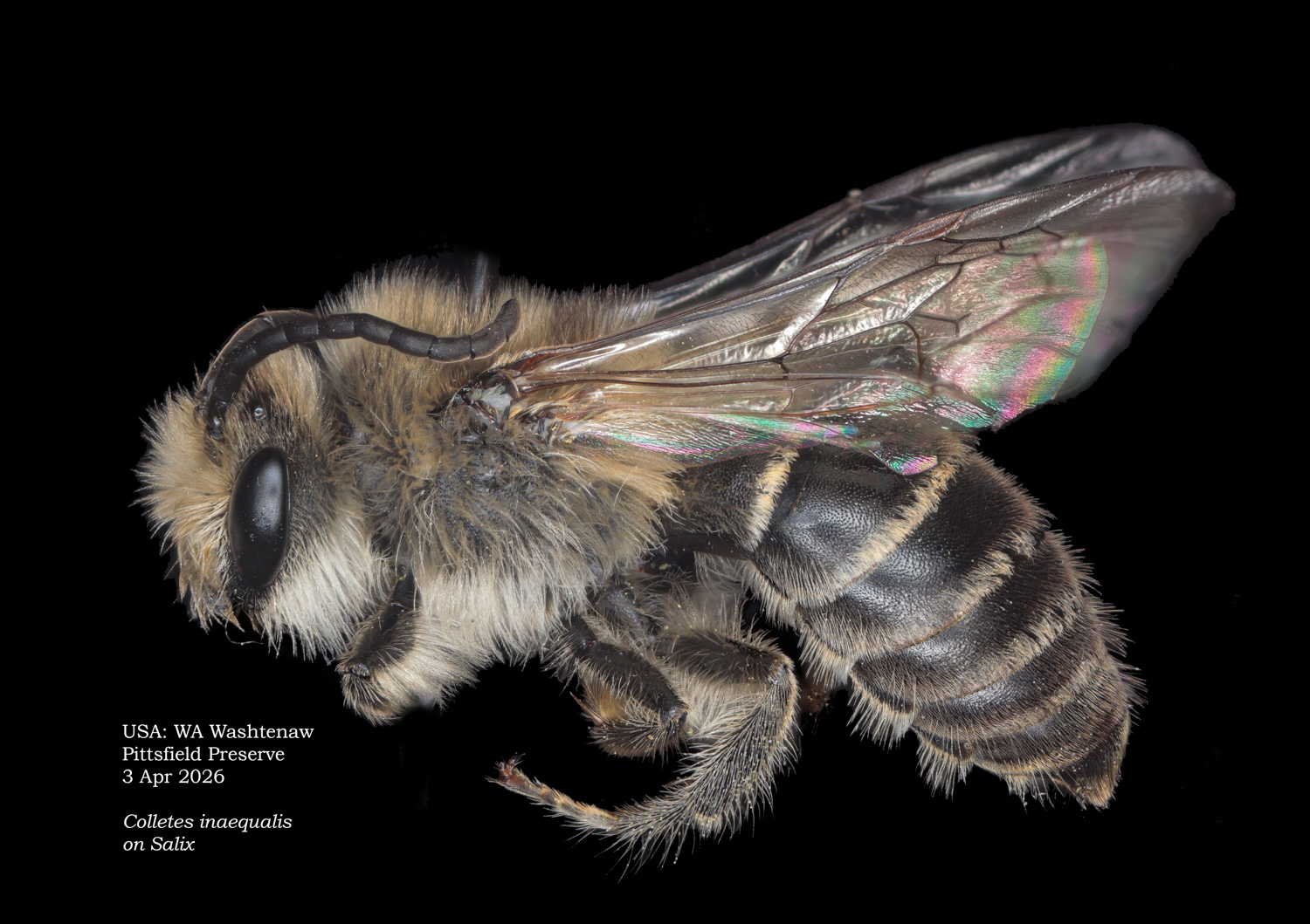 At our first training session April 9, we practiced netting on a set of willows, which were buzzing with insects. Many were beyond the reach of nets, but we did capture 47 specimens, that included 15 species. Standouts: Andrena and Colletes inaequalis males. |