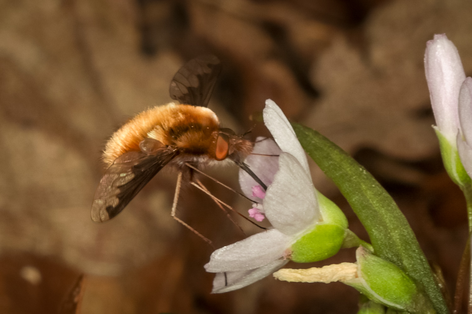 The most common spring beauty visitor I saw was the beefly, Bombyliius major. These are parasites of bee nests.
